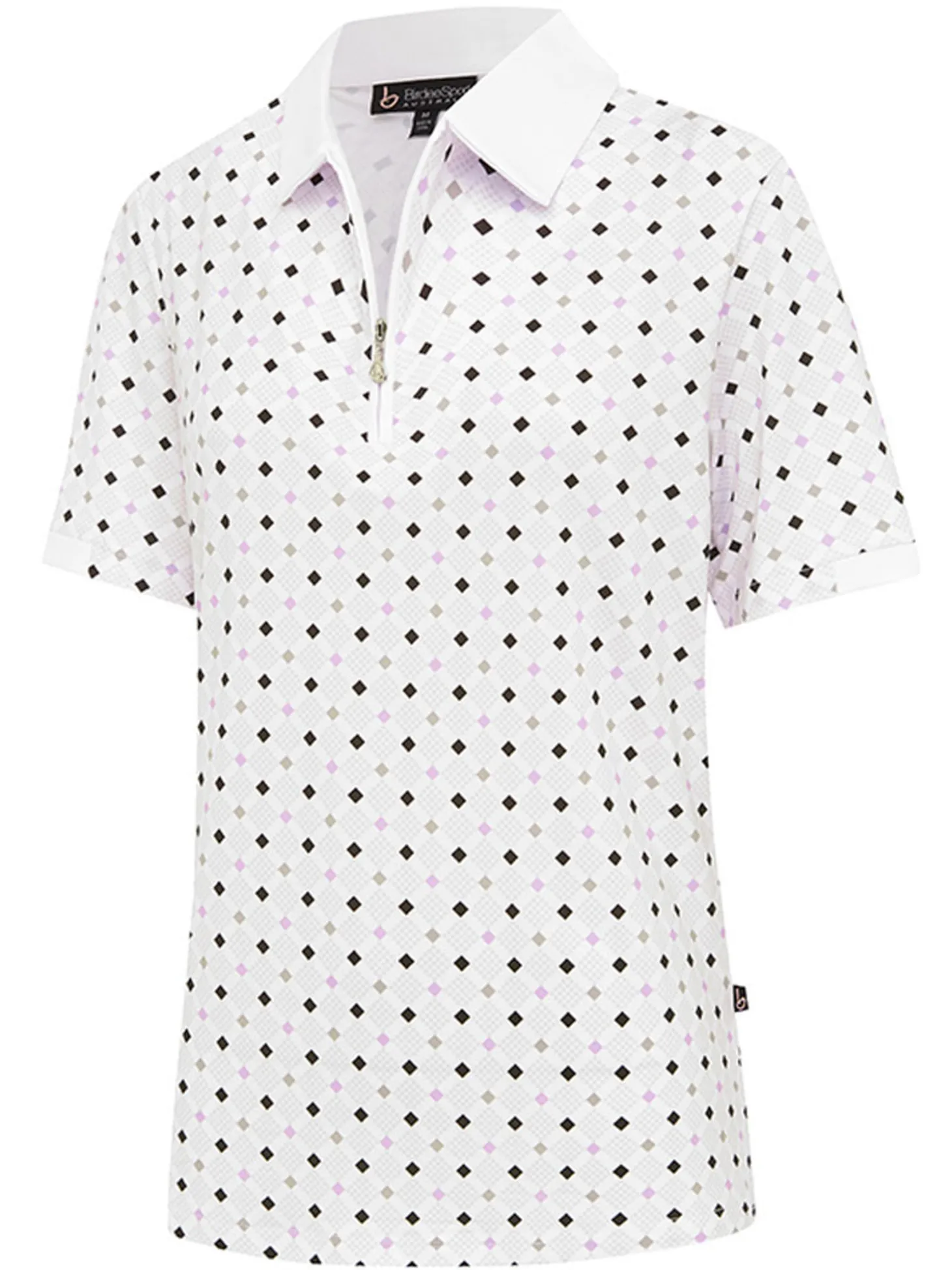 The Birdee Sport Women’s Pyramid Ambrose Short Sleeve Top (White Lilac) provides effortless style and comfort with its all-over harlequin pattern and contrast collar.