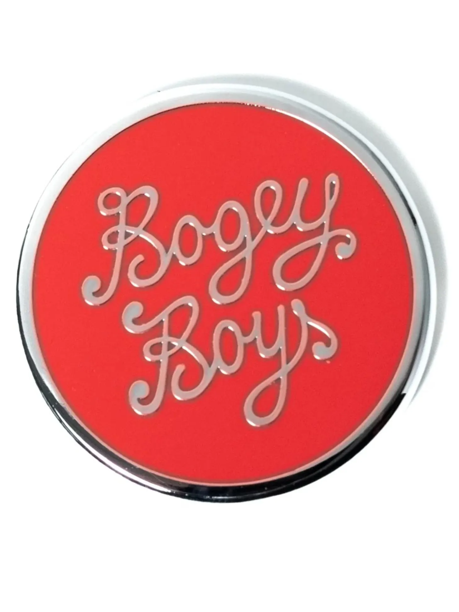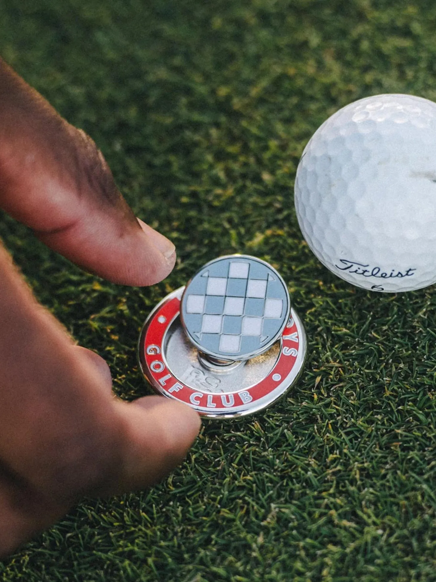 The Bogey Boys Check Ball Marker (Tangerine) has a two-sided design with a magnetic well for the detachable marker and features our BBGC Check logo design.