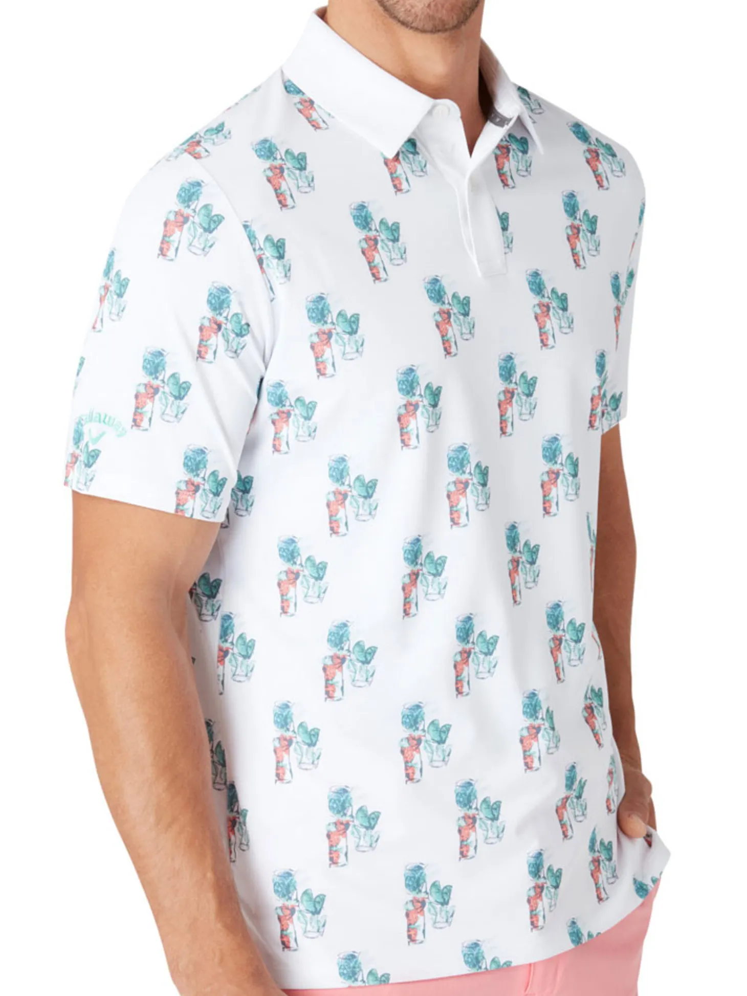 The Callaway 19th Hole Polo (White) features a golf cocktail-inspired print for an elevated look. Perfect for sunny days, this golf polo shirt also sports sun protection to block harmful UV rays.