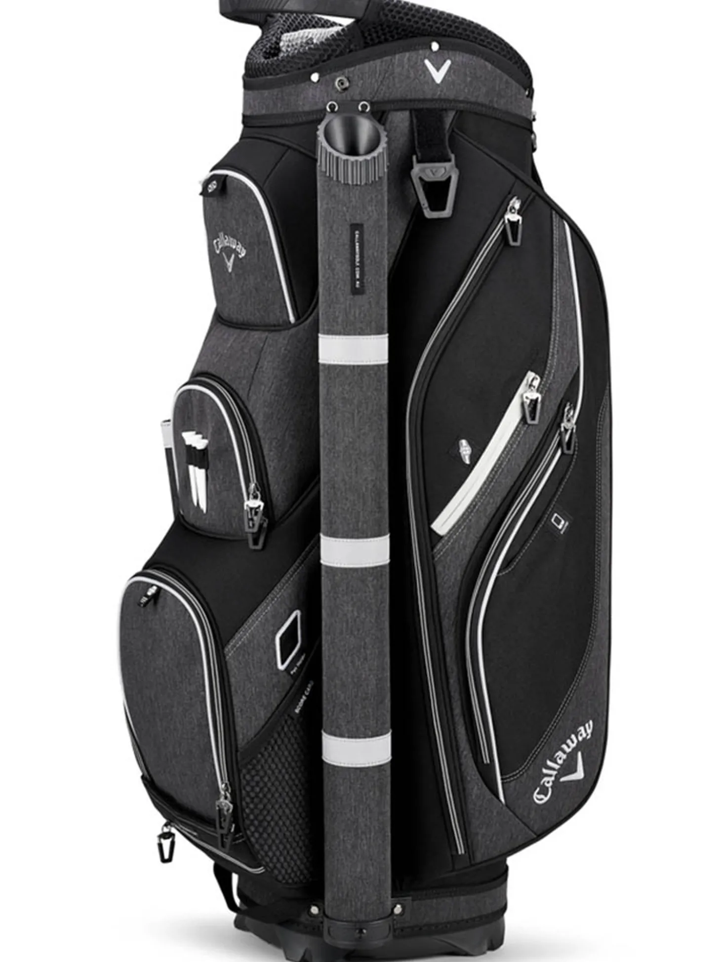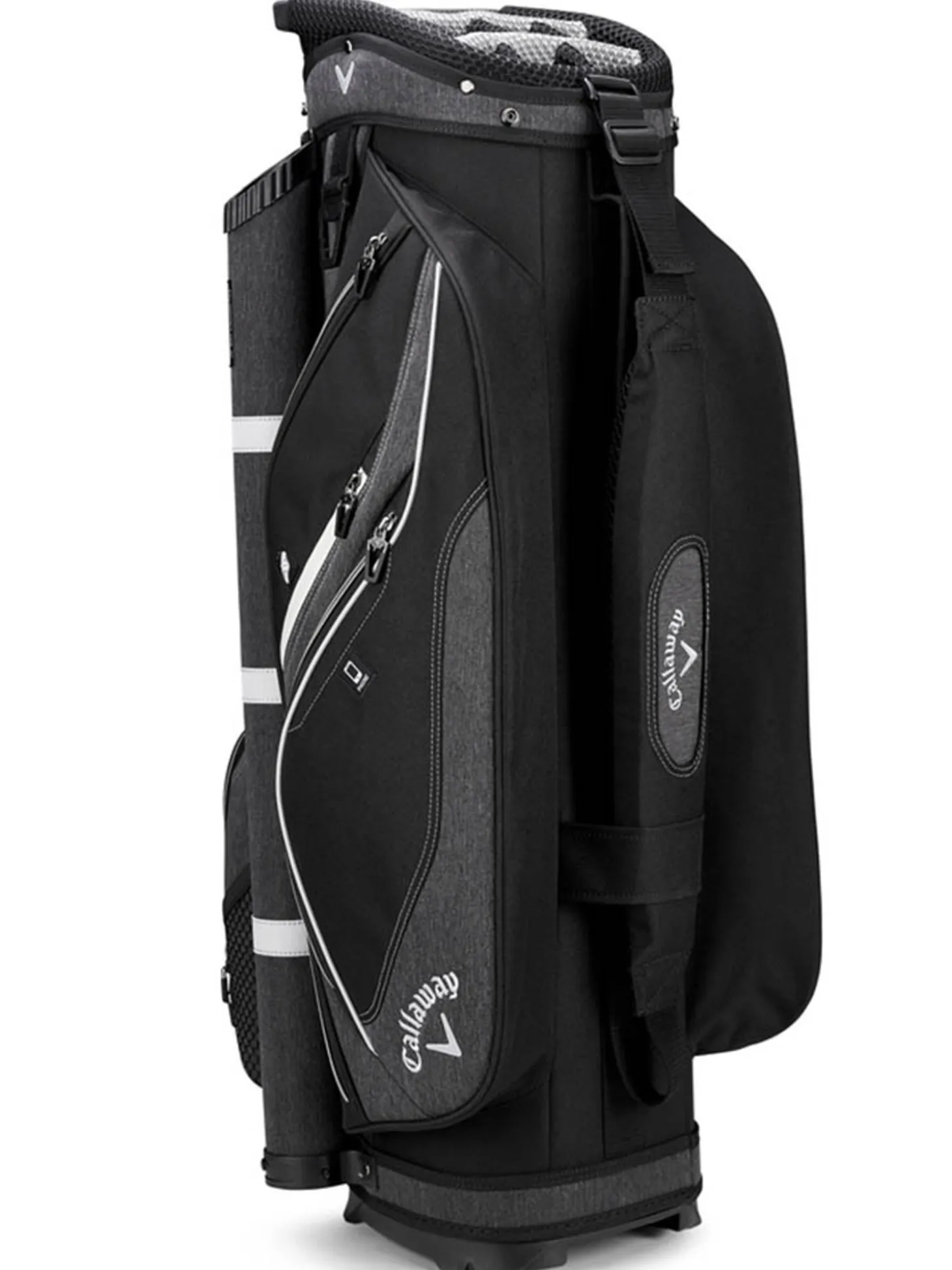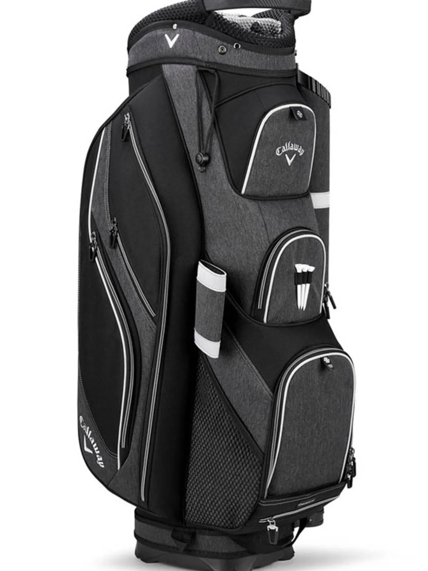 The Callaway Forrester 19 Cart Bag (Black) is designed to hold anything you would ever need on the golf course and keep it organised. Featured pockets include a strategically placed sunglass and cell phone pocket, a velour-lined waterproof valuables pocket, and a thermal-lined cooler pocket large enough to get you through a whole round. A hidden pocket on the bottom conceals a full-sized rain cover for those harsh weather days.