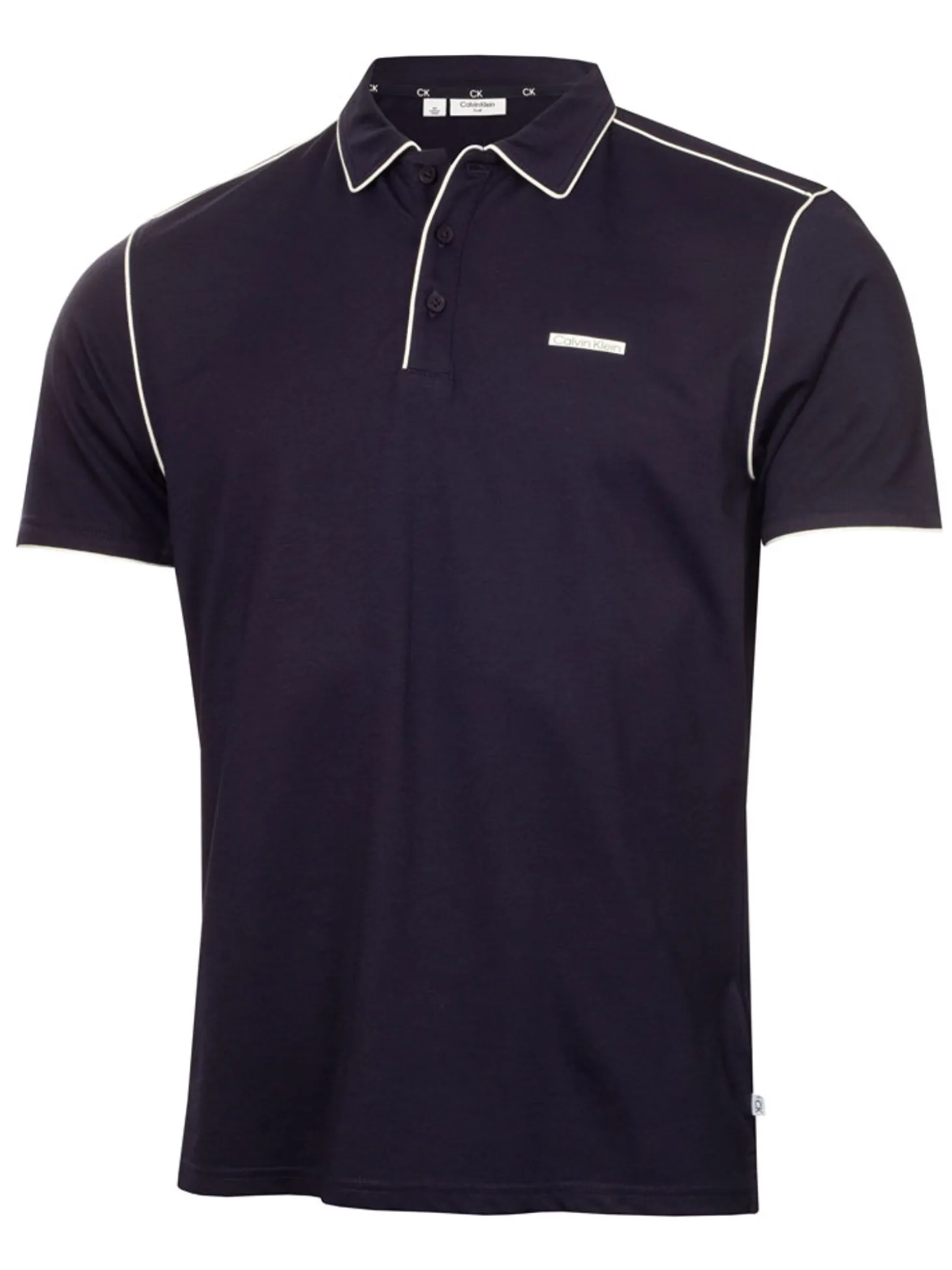 - Calvin Klein silicone badge logo on the left chest and CK golf woven tab to lower left side seam.