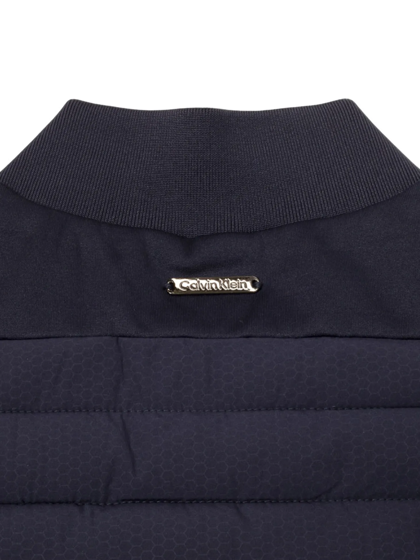 - High gloss printed Calvin Klein logo on left chest and metal logo badge on back of neck