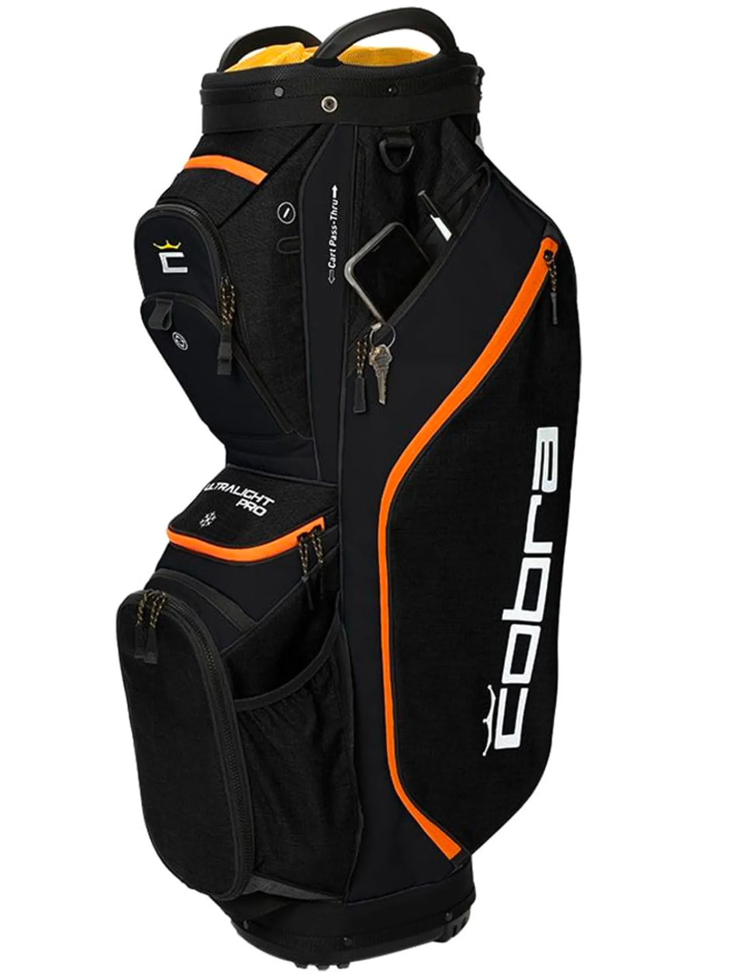 The Cobra Ultralight Pro Cart Bag features a cart strap PASS-THROUGH, allowing access to every pocket while keeping the bag secure on cart. Designed with maximum storage, including a large insulated cooler pocket which holds 12 ounce cans and dual fleece lined valuables pockets.