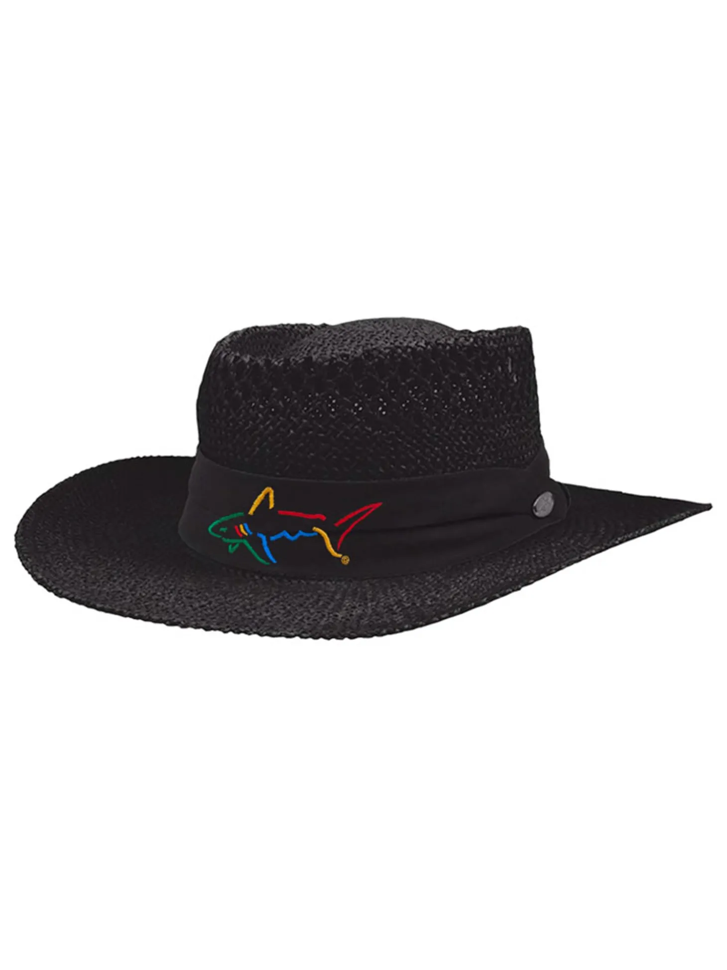 The Greg Norman Signature Straw Hat (Black) has paper construction for airflow and breathability, All-around brim for sun shade, Four colour Shark logo embroidered on band with debossed Shark emblem.