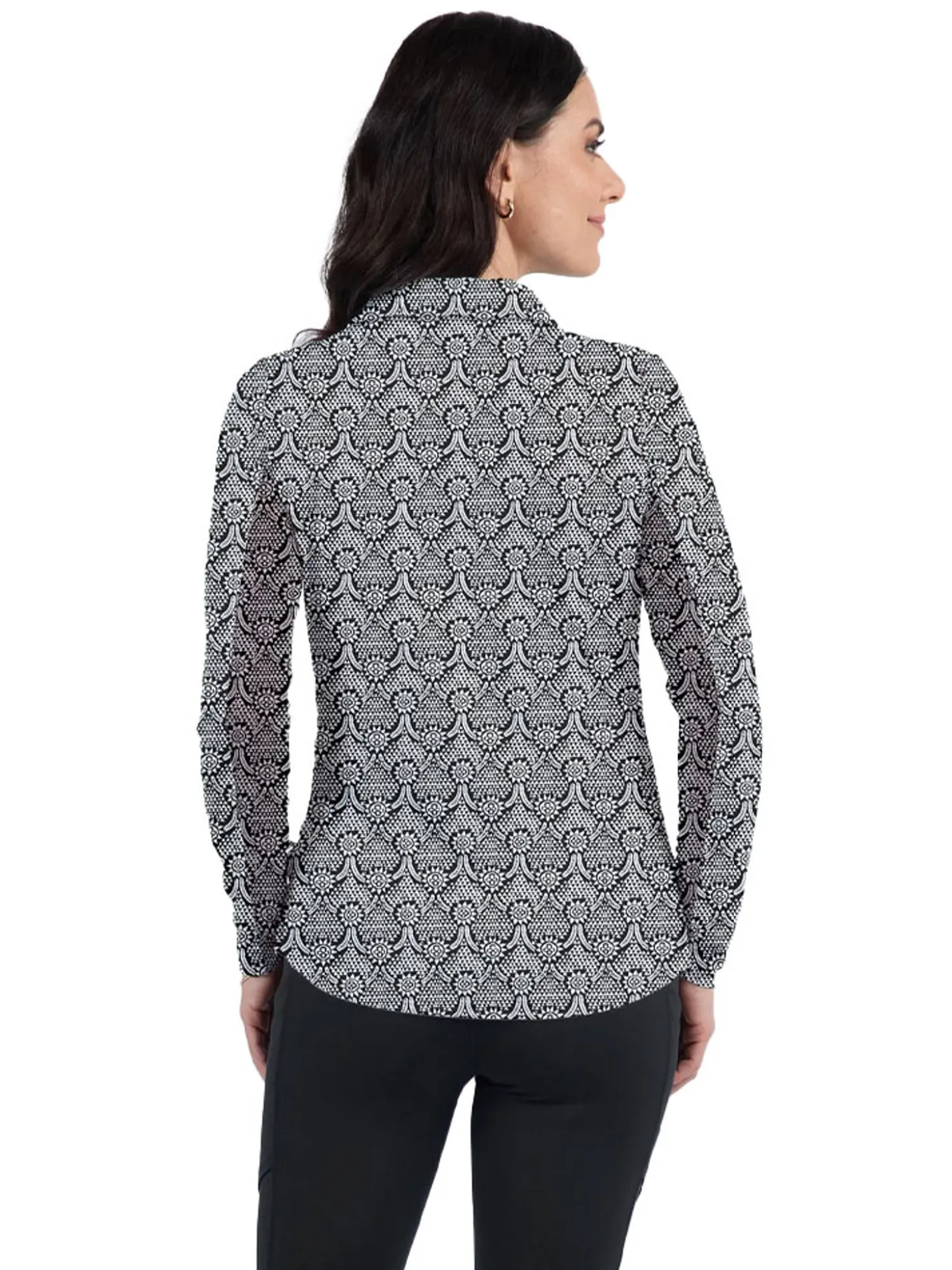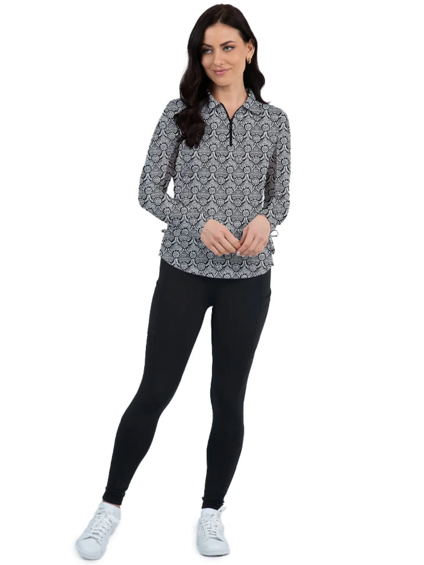 The IBKUL Leslie Print Long Sleeve Zip Polo (Black) is designed with an all-over print in the brand’s patented iceƒil technology and mesh underarm panels that give you extra style, reach, and breathability.