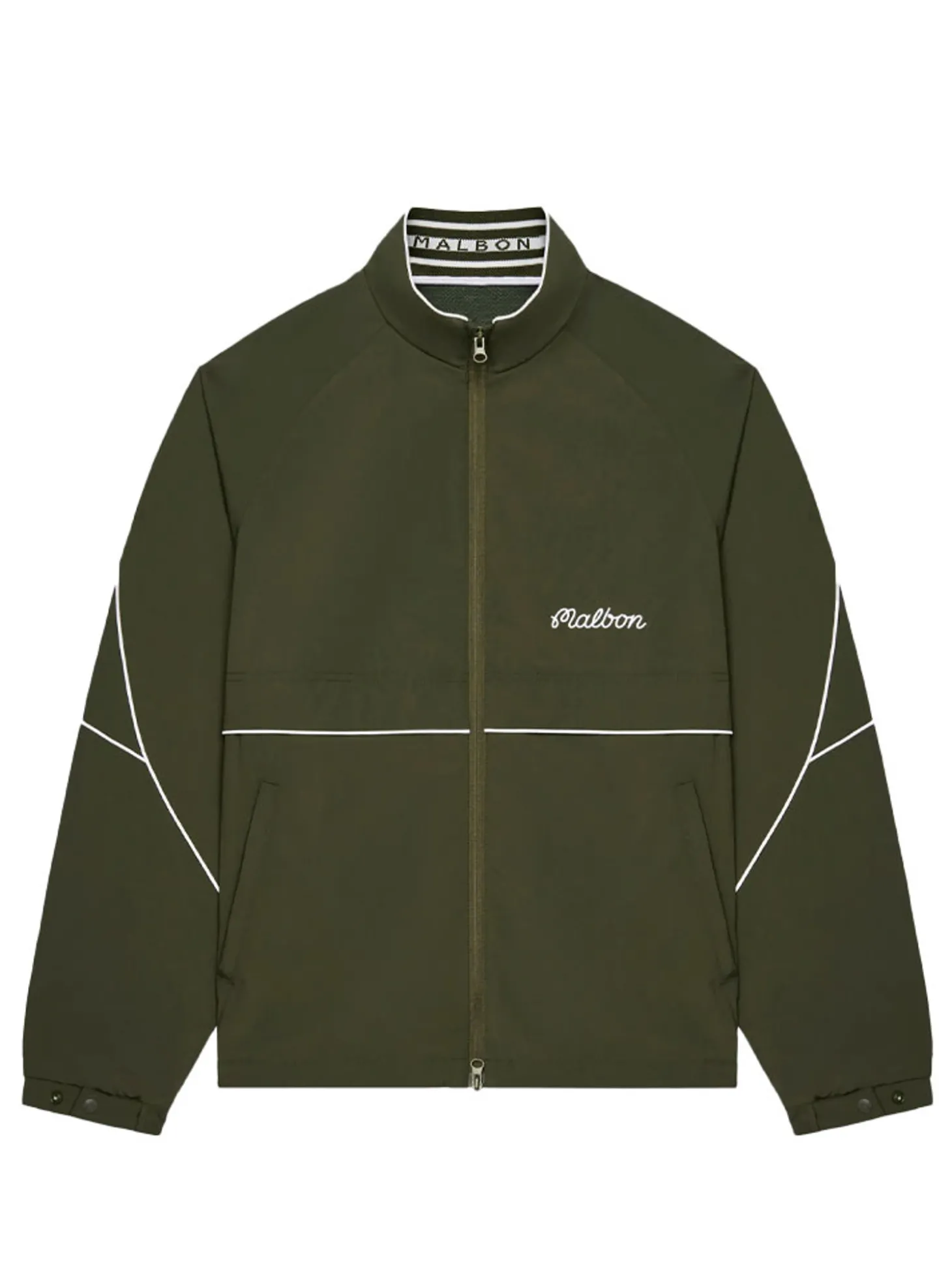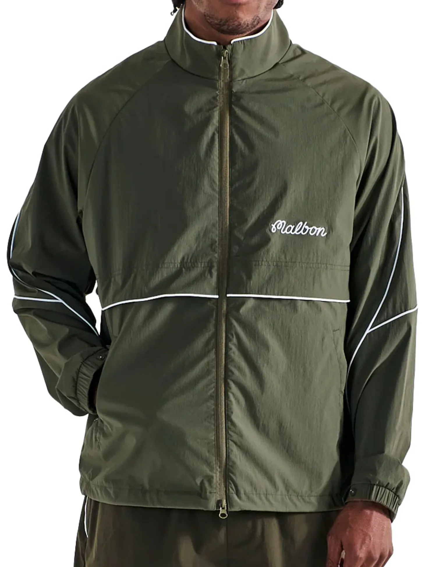 The Malbon Riva Nylon Jacket (Green) features a versatile two-way zipper closure and strategic open venting for customised comfort in changing conditions. Refined details like elastic cuffs and an adjustable drawcord waistband ensure an ideal fit, enhancing both functionality and contemporary sensibilities.