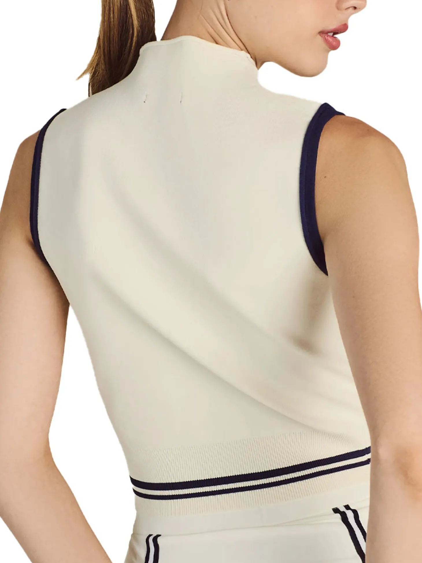 The Malbon Womens Kara Mock Neck Vest (Ivory) provides core warmth without restricting movement. Its contemporary design features precisely placed ribbing and subtle branding, allowing for seamless transition from the course to daily wear.