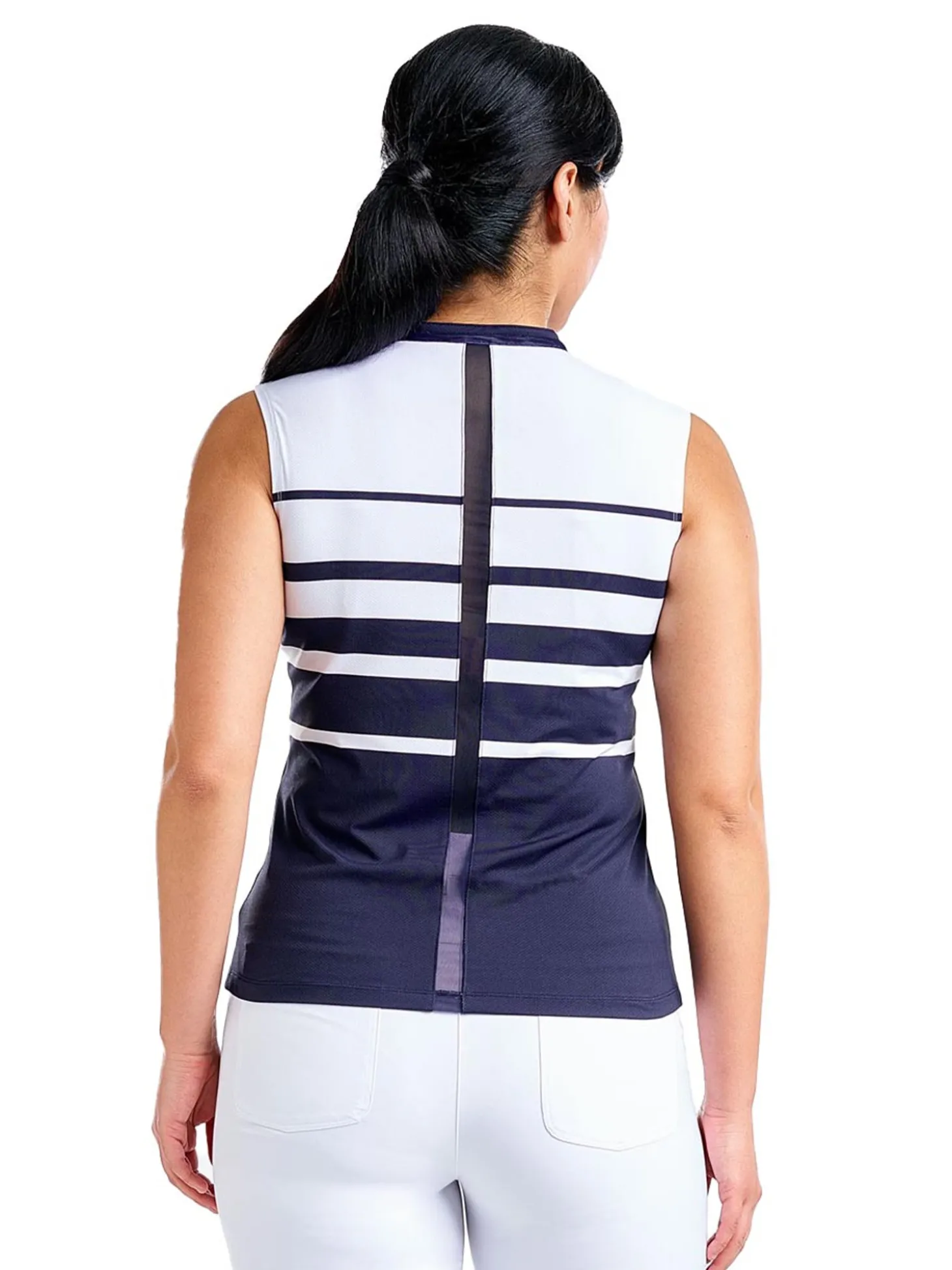 The Nivo Linnea Sleeveless Livcool Mock (White Navy) is the ultimate fusion of femininity and sportiness. It is designed specifically for the active woman golfer, ensuring you stay cool and dry even during intense rounds.