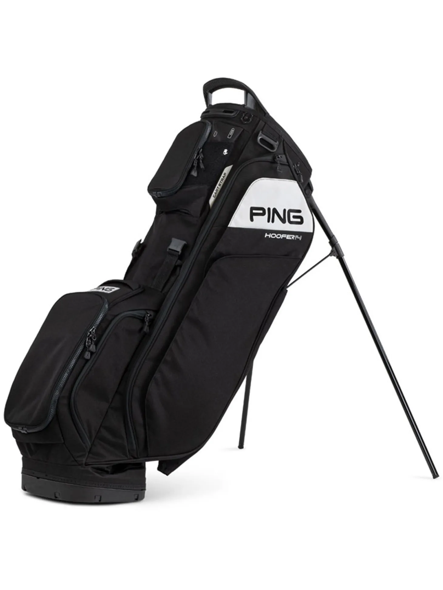 The Ping Hoofer 14 Stand Bag has an innovative bottom that improves club removal by guiding clubs to the correct segment and keeping clubs separated while carrying.