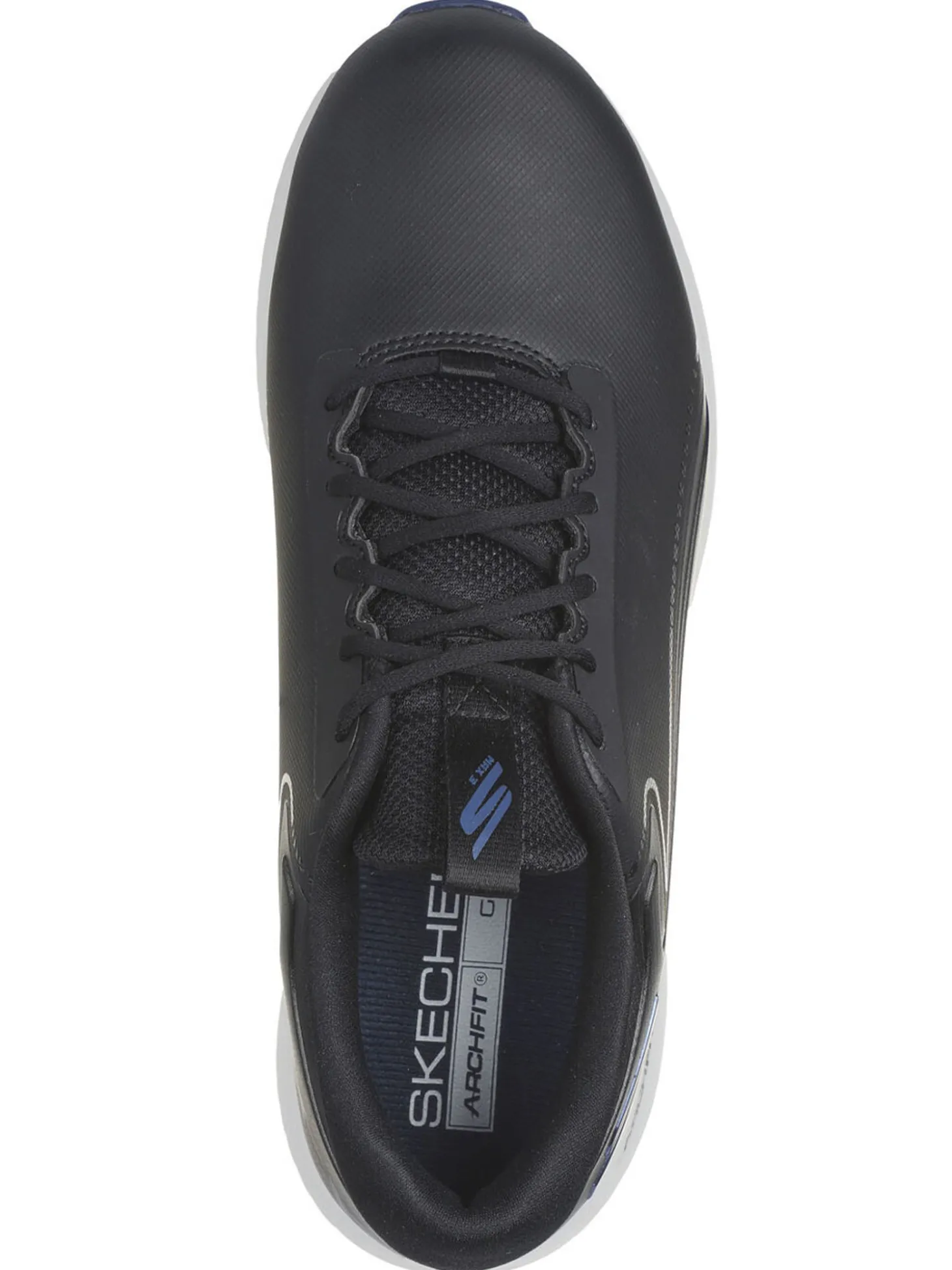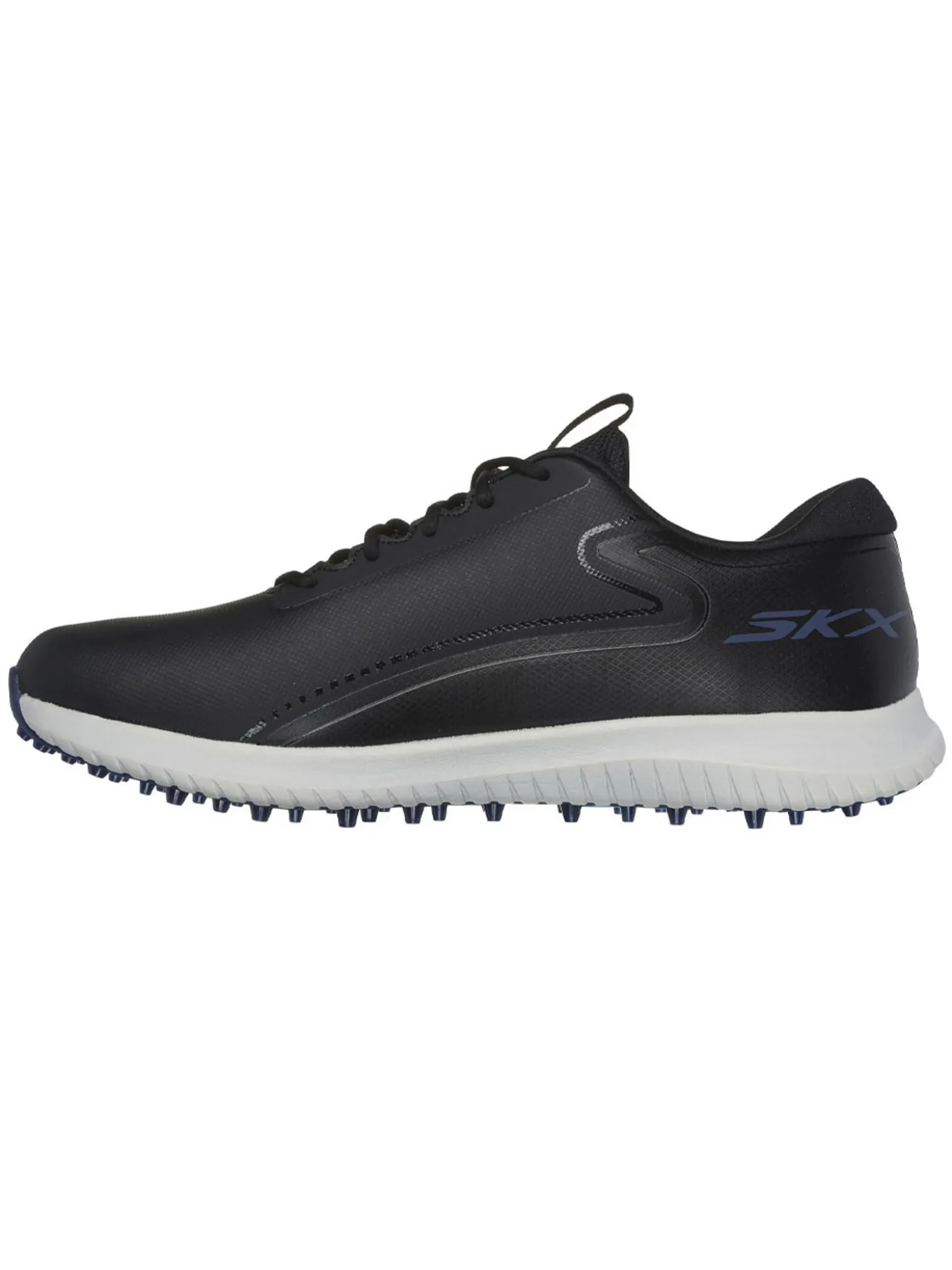 The Skechers GO GOLF Max 3 Golf Shoes (Black) features a lace-up waterproof synthetic leather upper with protective hotmelt overlays, removable Arch Fit insole, lightweight ULTRA FLIGHT cushioning and spikeless outsole.