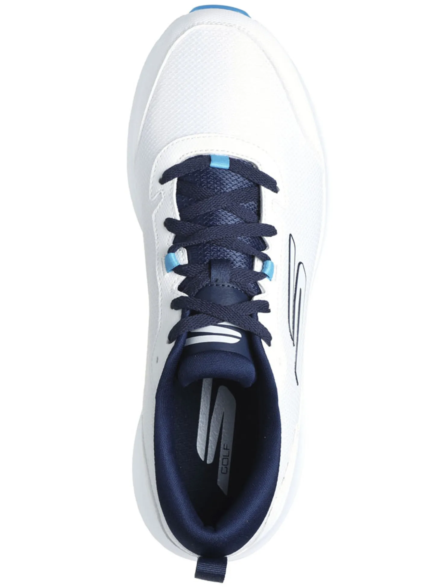 The Skechers GO GOLF Max Fairway 4 Golf Shoes (White Navy) let you dominate the course in all-day supportive comfort. This water-repellent design features a lace-up mesh upper with synthetic overlays, Goga Max technology insole, lightweight ULTRA FLIGHT cushioning, and a spikeless outsole.