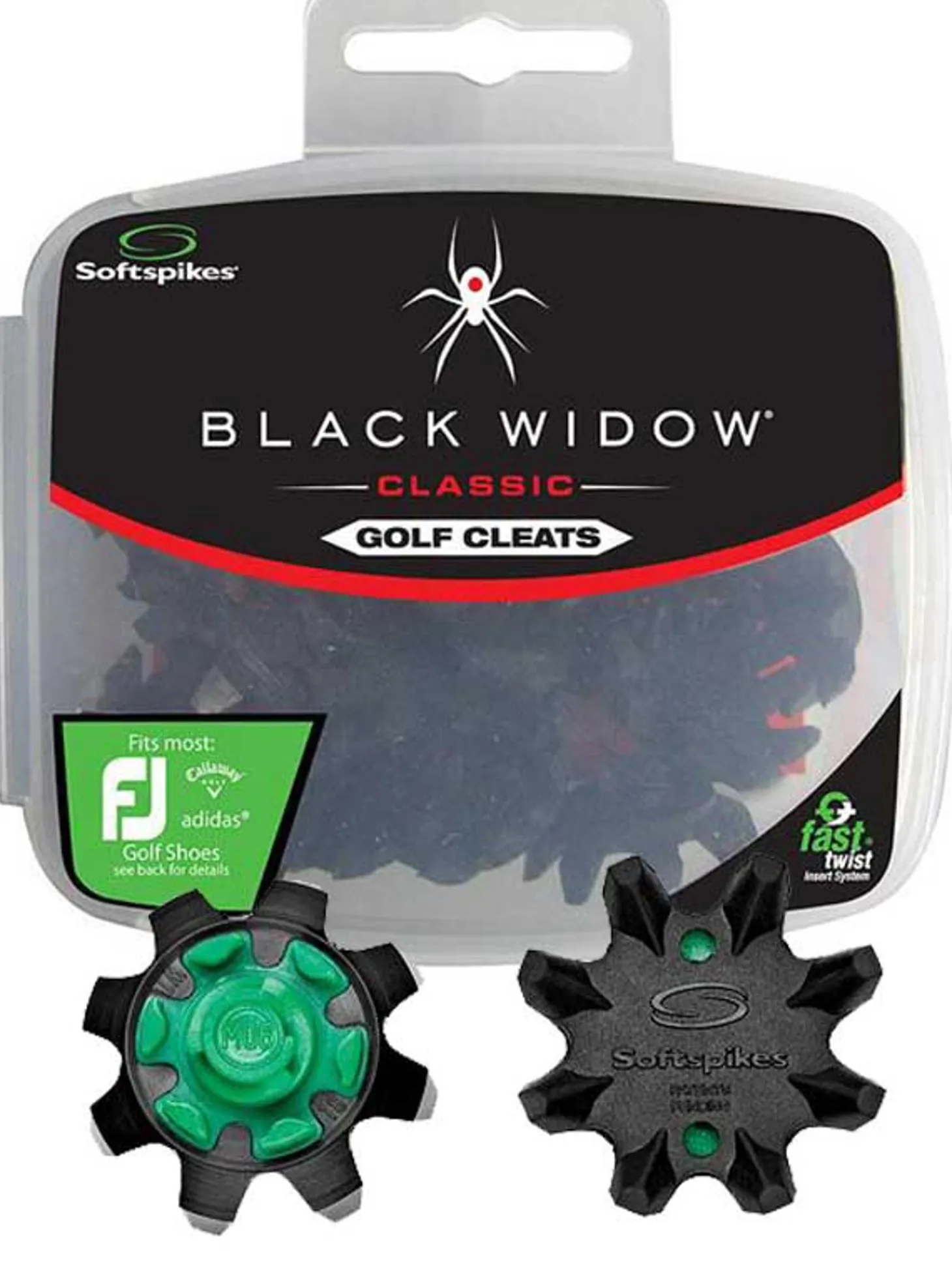 The SoftSpikes Black Widow Golf Cleats Fast Twist is the original plastic replacement spike and is the most widely used replacement spike on the market. Black Widow spikes are designed for all-day comfort while providing all the traction needed when you end up in a tough spot. The eight points of contact offer green-friendly performance in a replacement spike.