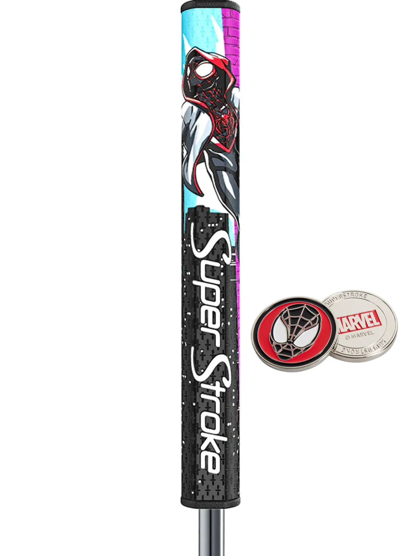 The SuperStroke Tour 2.0 Marvel Putter Grip & Ball Marker (Miles Morales) is available in the Tour 2.0 design, a classic and highly sought-after putter grip profile. Matching Ball Marker: Each Marvel SuperStroke grip comes with a matching ball marker.