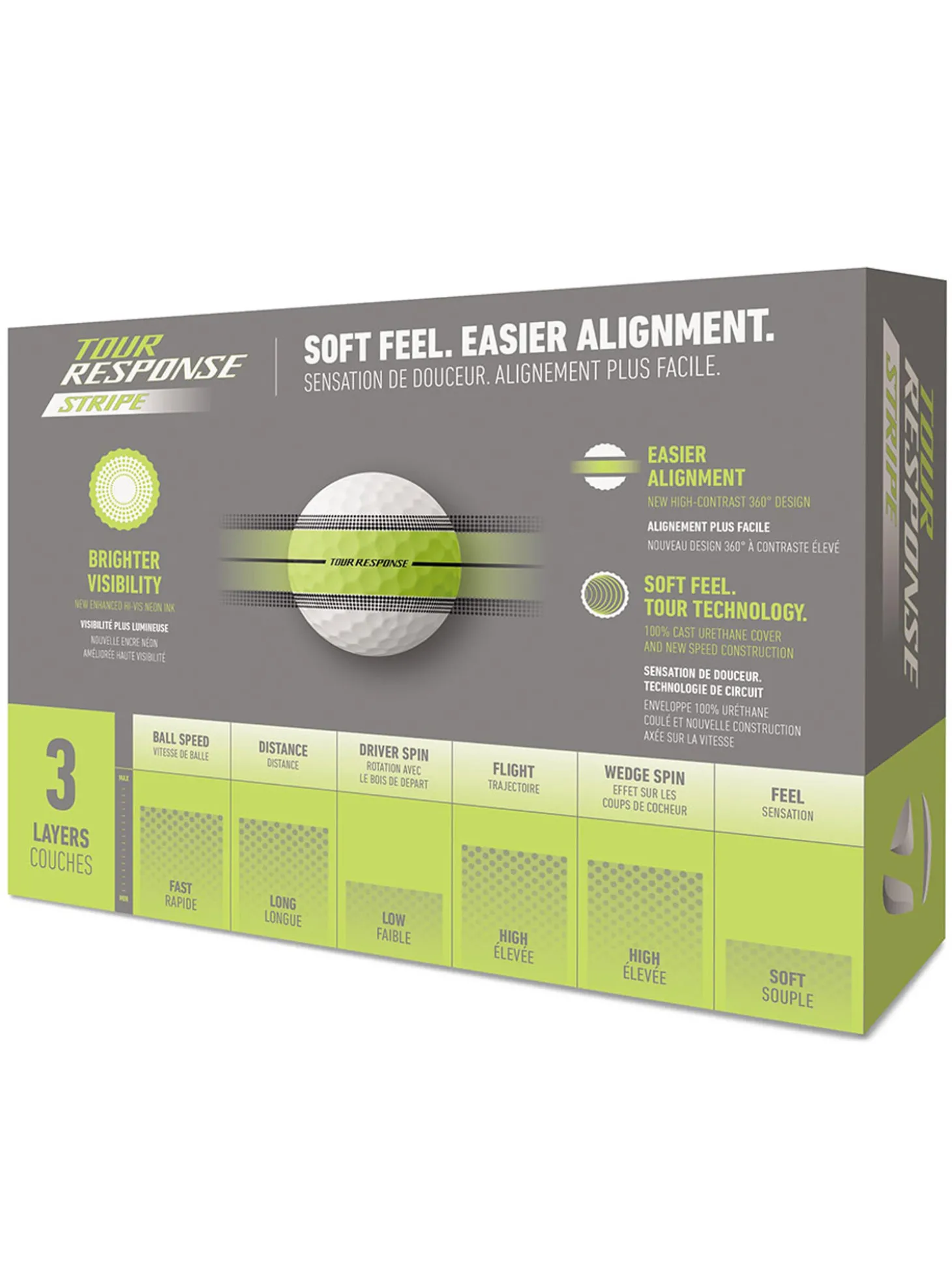 Tour Response Stripe is engineered to respond to your game with a 100% urethane cover for added greenside spin and better feel vs. ionomer. The soft material helps wedge grooves grip the ball better on shots into the green while maintaining shear resistance and greater durability. - DESIGNED FOR FAST BALL SPEEDS