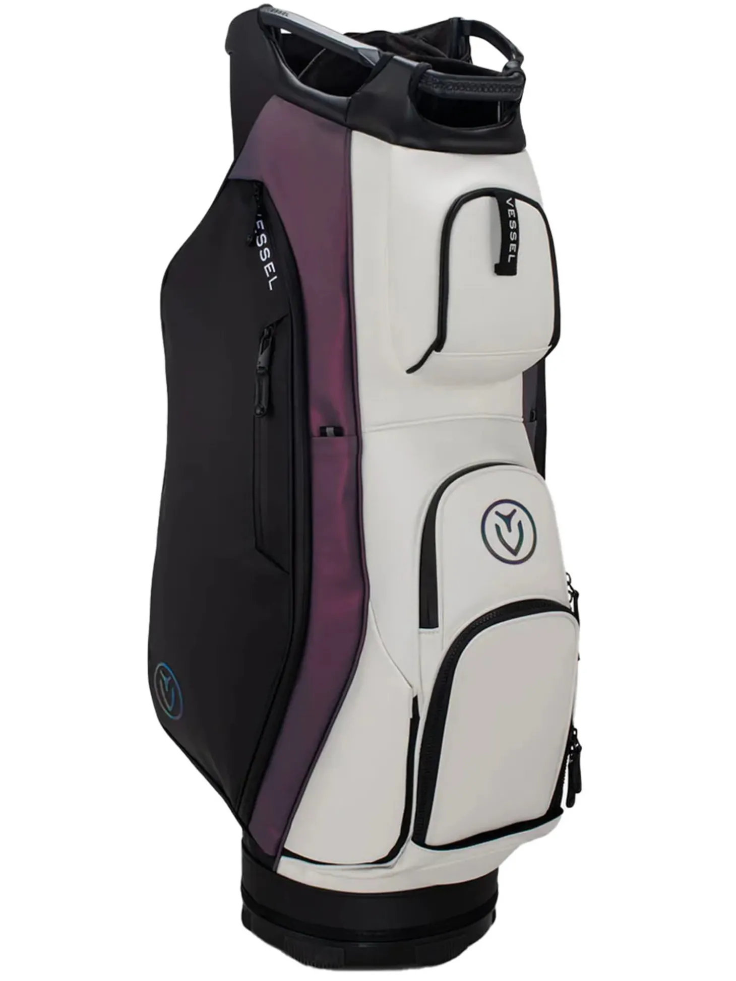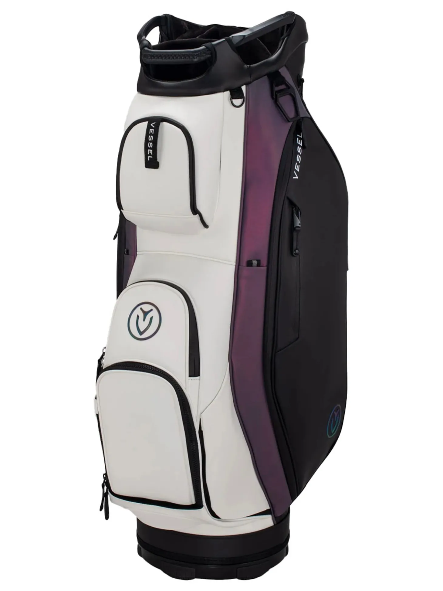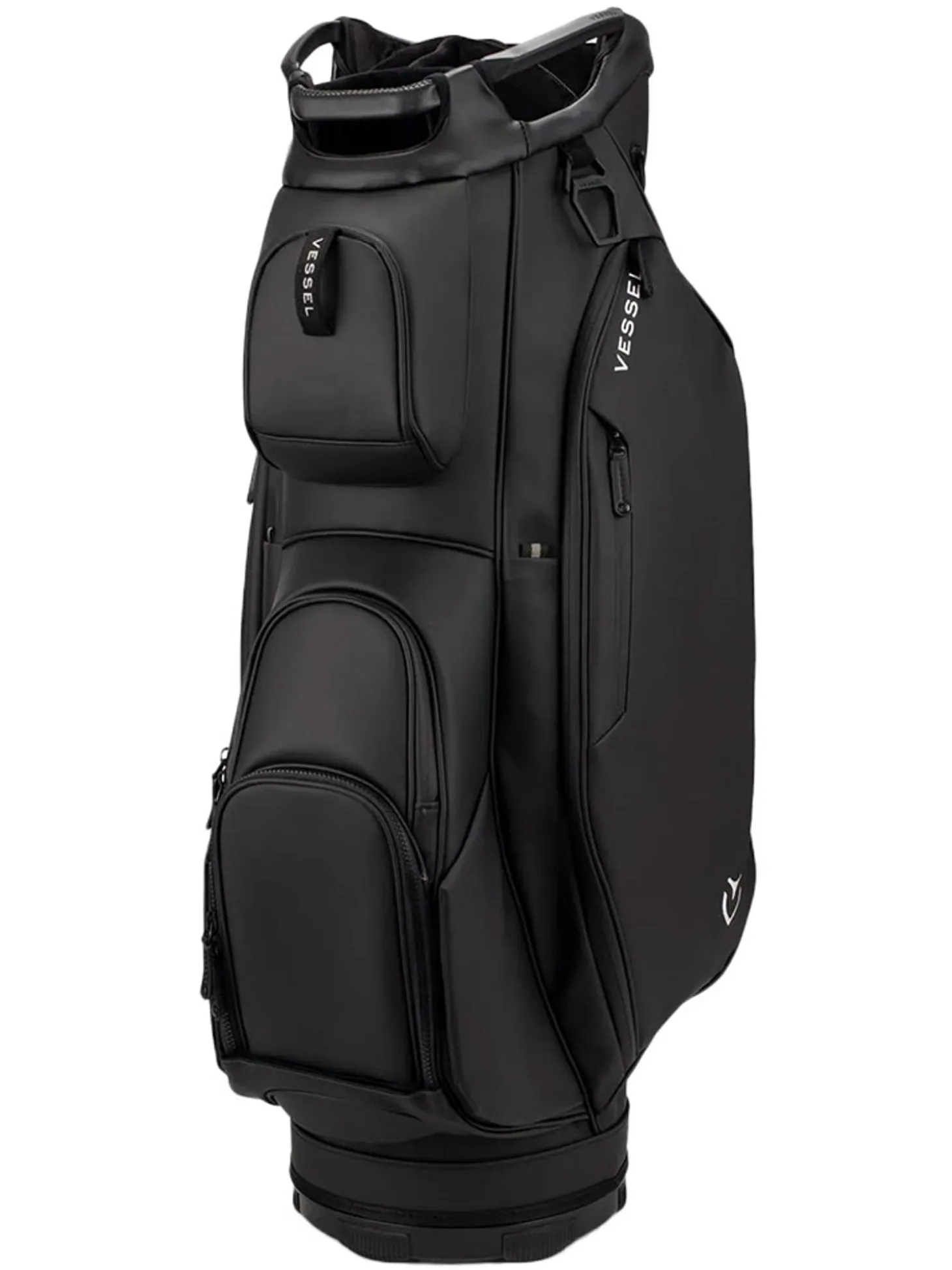 The Vessel Lux Cart bag was intentionally designed to give you a premium riding experience. Starting with 2 forward-facing pockets and an upper pocket pod that swings over the cart strap and snaps down with a magnetic closure, securing your bag in place without restricting access to essentials while on a cart. With two antimicrobial lined personals pockets and a lockable valuables pocket, this cart bag offers plenty of storage for your valuables. Two carry handles and a padded single strap are included for a comfortable carry from the golf cart to the car.Dual water bottle sleeves and a large cooler-lined compartment, fit plenty of beverages for a full round. Both top sizes feature a dedicated putter well and microfiber-lined dividers for optimal club storage. Crafted with our signature attention to detail, the Lux Cart boasts genuine leather touchpoints, chrome finishes, and tour-grade body materials.