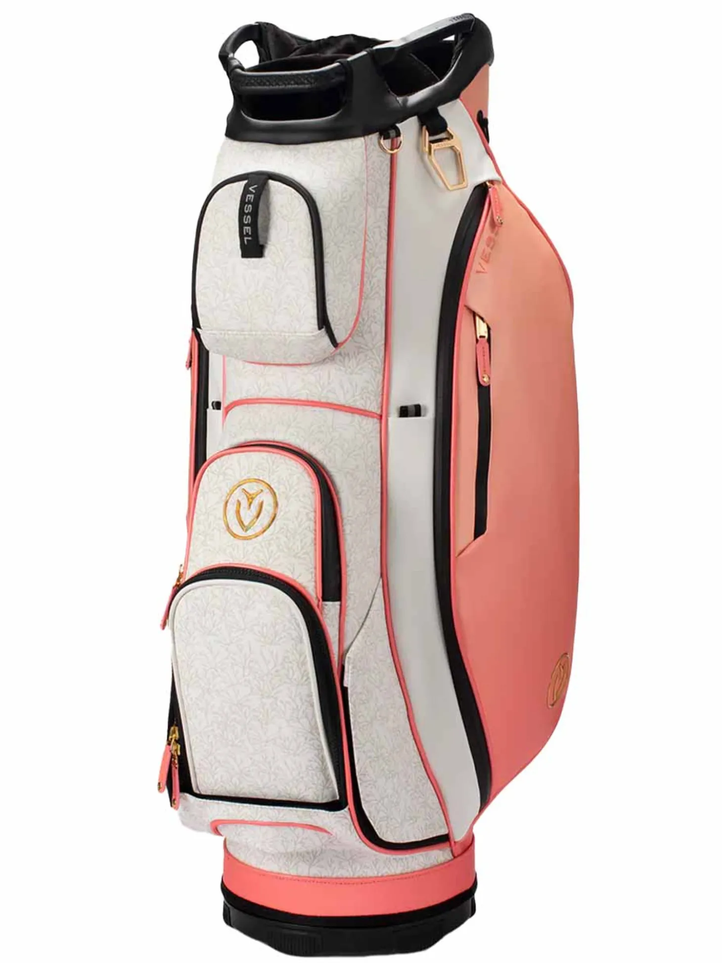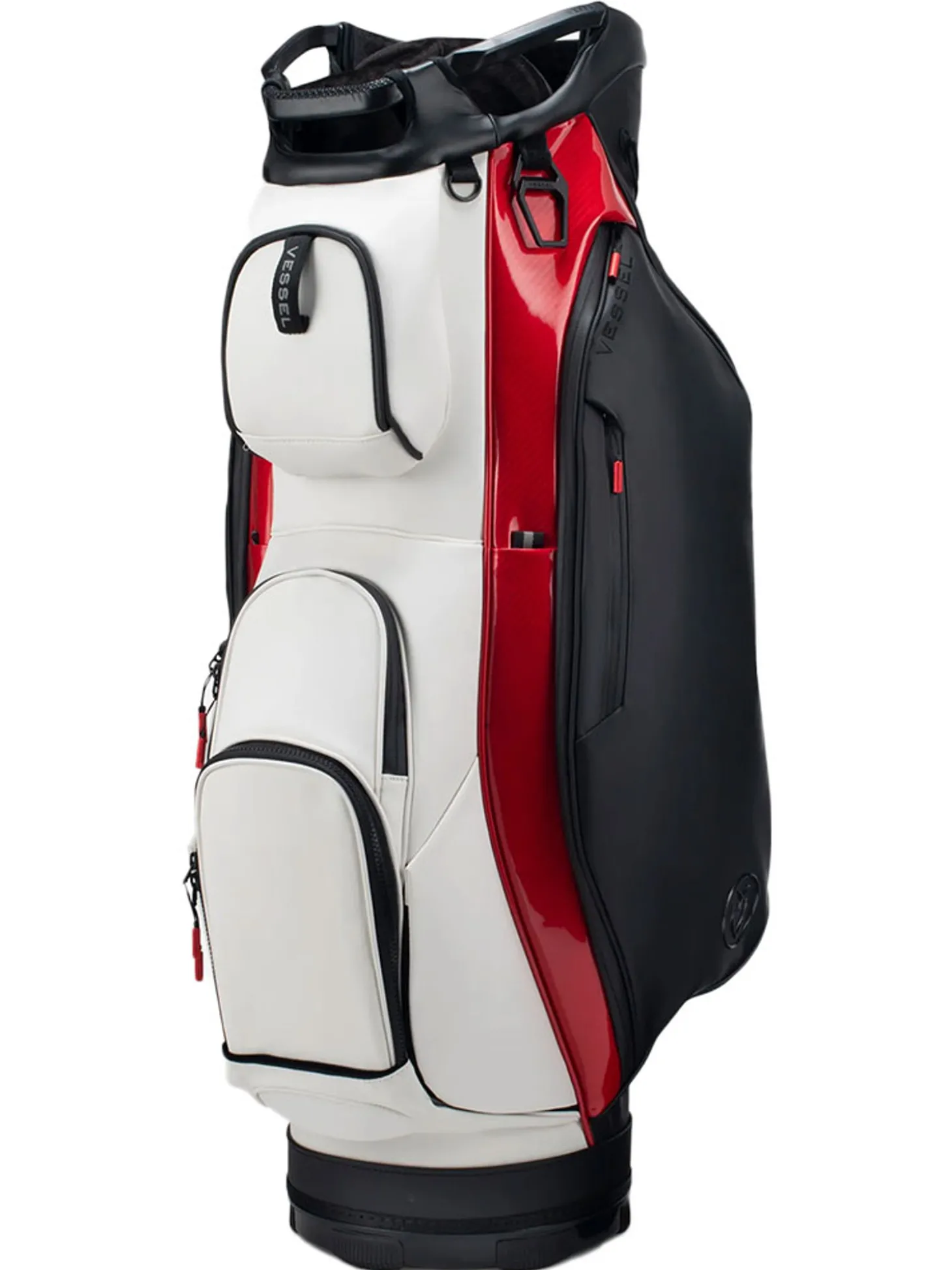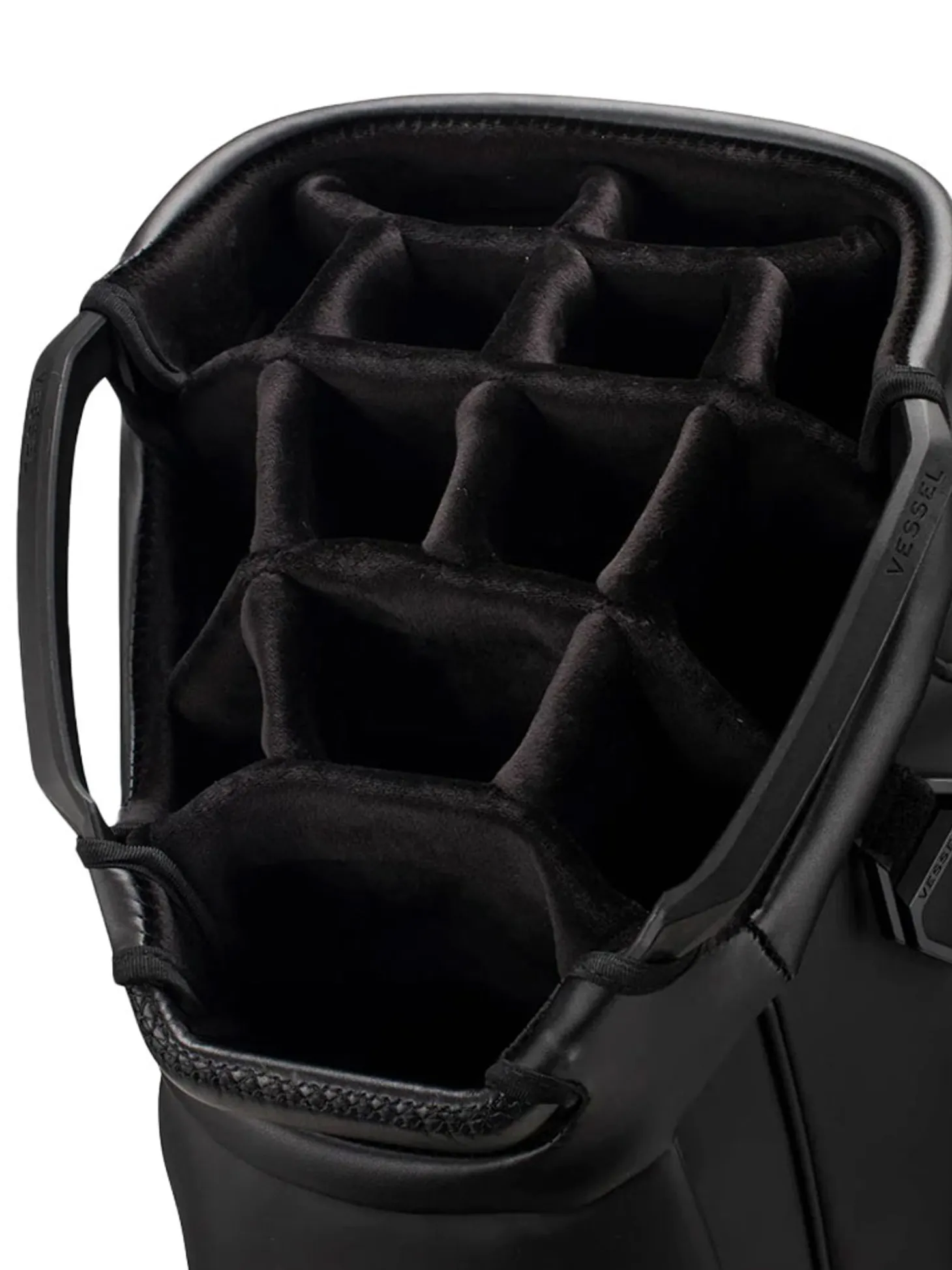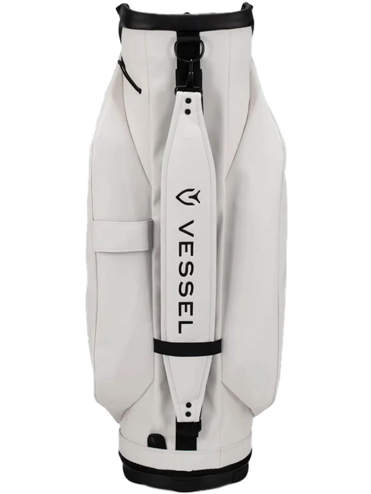 The Vessel Lux Cart bag was intentionally designed to give you a premium riding experience. Starting with 2 forward-facing pockets and an upper pocket pod that swings over the cart strap and snaps down with a magnetic closure, securing your bag in place without restricting access to essentials while on a cart. With two antimicrobial lined personals pockets and a lockable valuables pocket, this cart bag offers plenty of storage for your valuables. Two carry handles and a padded single strap are included for a comfortable carry from the golf cart to the car.Dual water bottle sleeves and a large cooler-lined compartment, fit plenty of beverages for a full round. Both top sizes feature a dedicated putter well and microfiber-lined dividers for optimal club storage. Crafted with our signature attention to detail, the Lux Cart boasts genuine leather touchpoints, chrome finishes, and tour-grade body materials.
