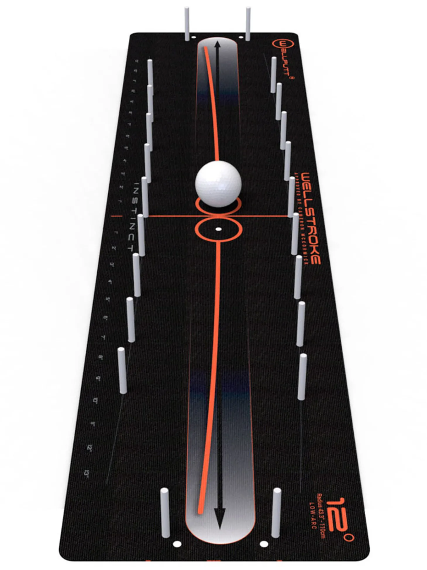 The WellStroke Instinct 18 Degree Arc Mat taps into your subconscious for a deep training experience. The motion-putting guide acts like lights on an airport runway, giving you a perfect visual of the arc and path your putter should travel back and through in order to roll it where you are looking with solid contact and the touch you intend on delivering.