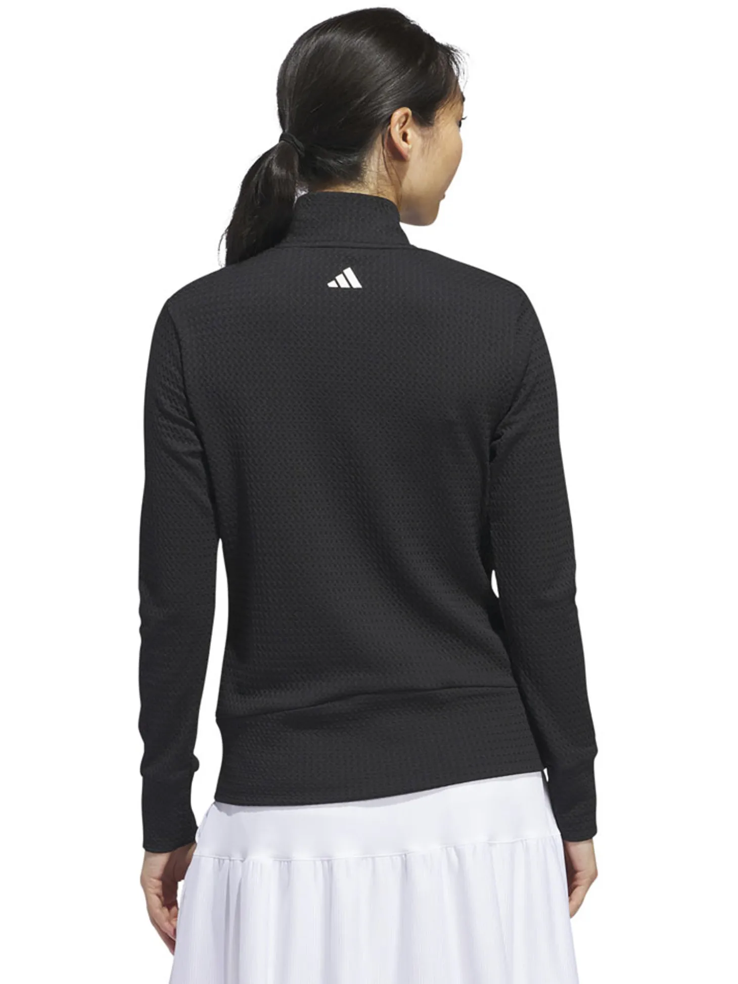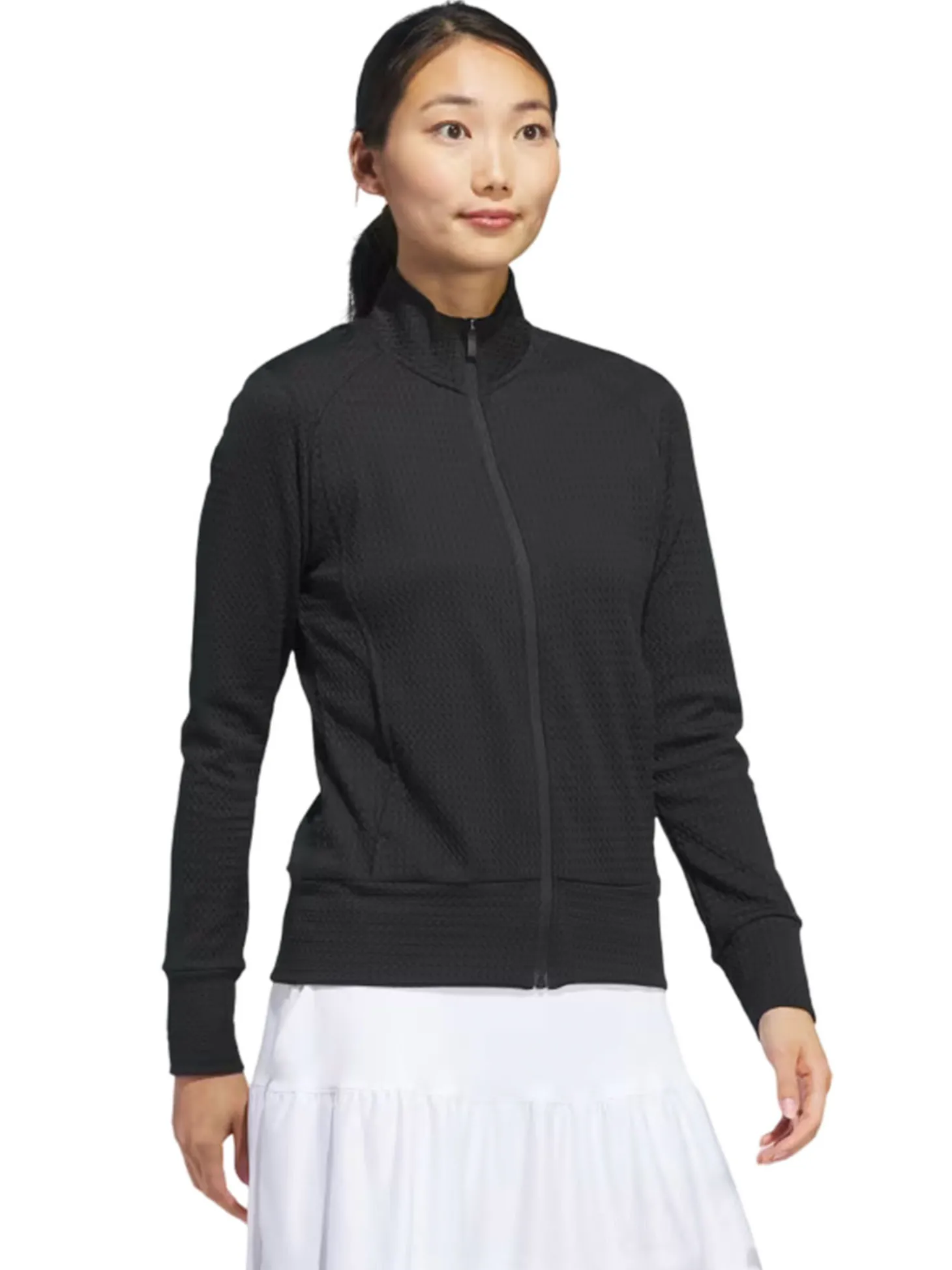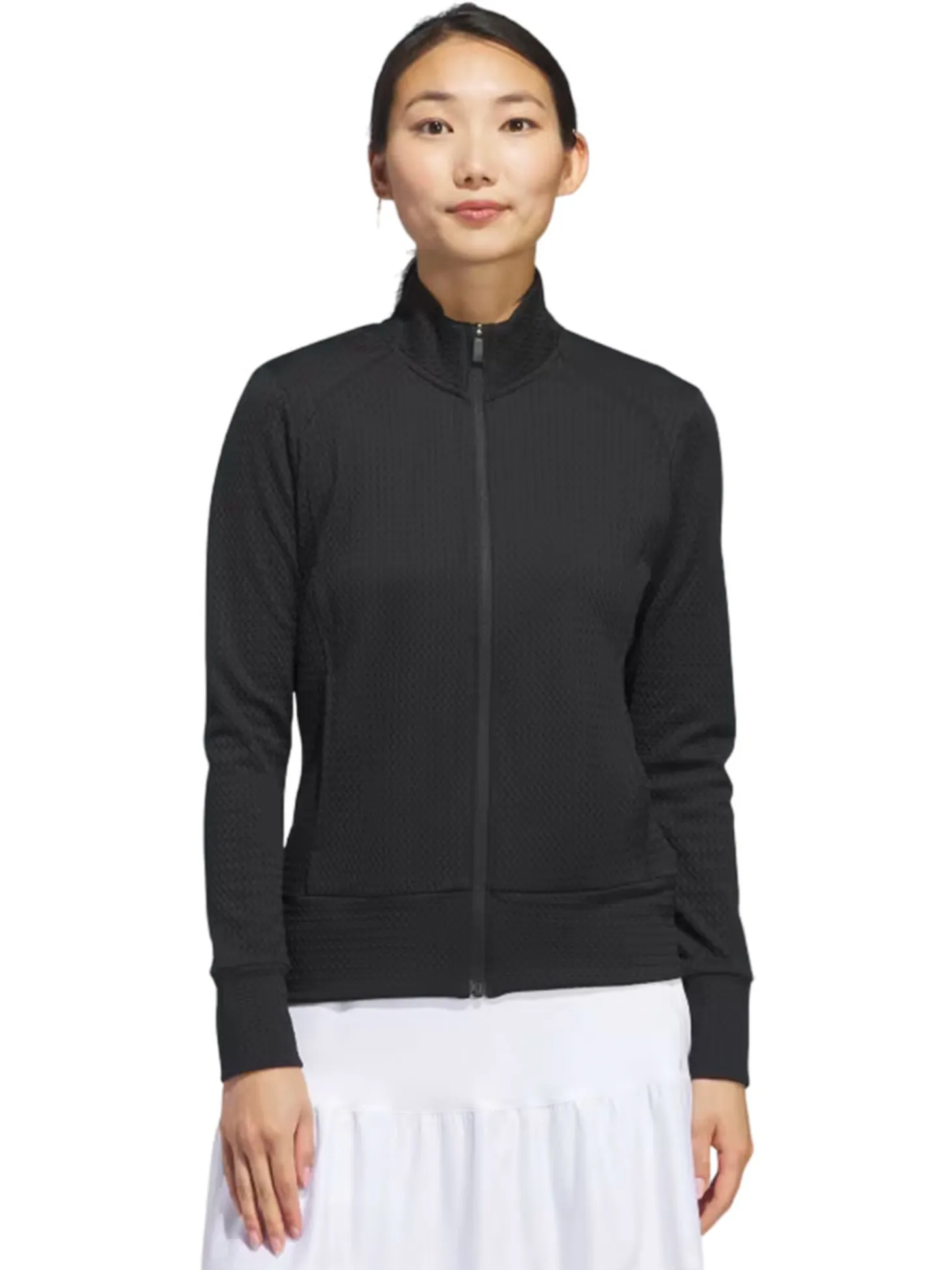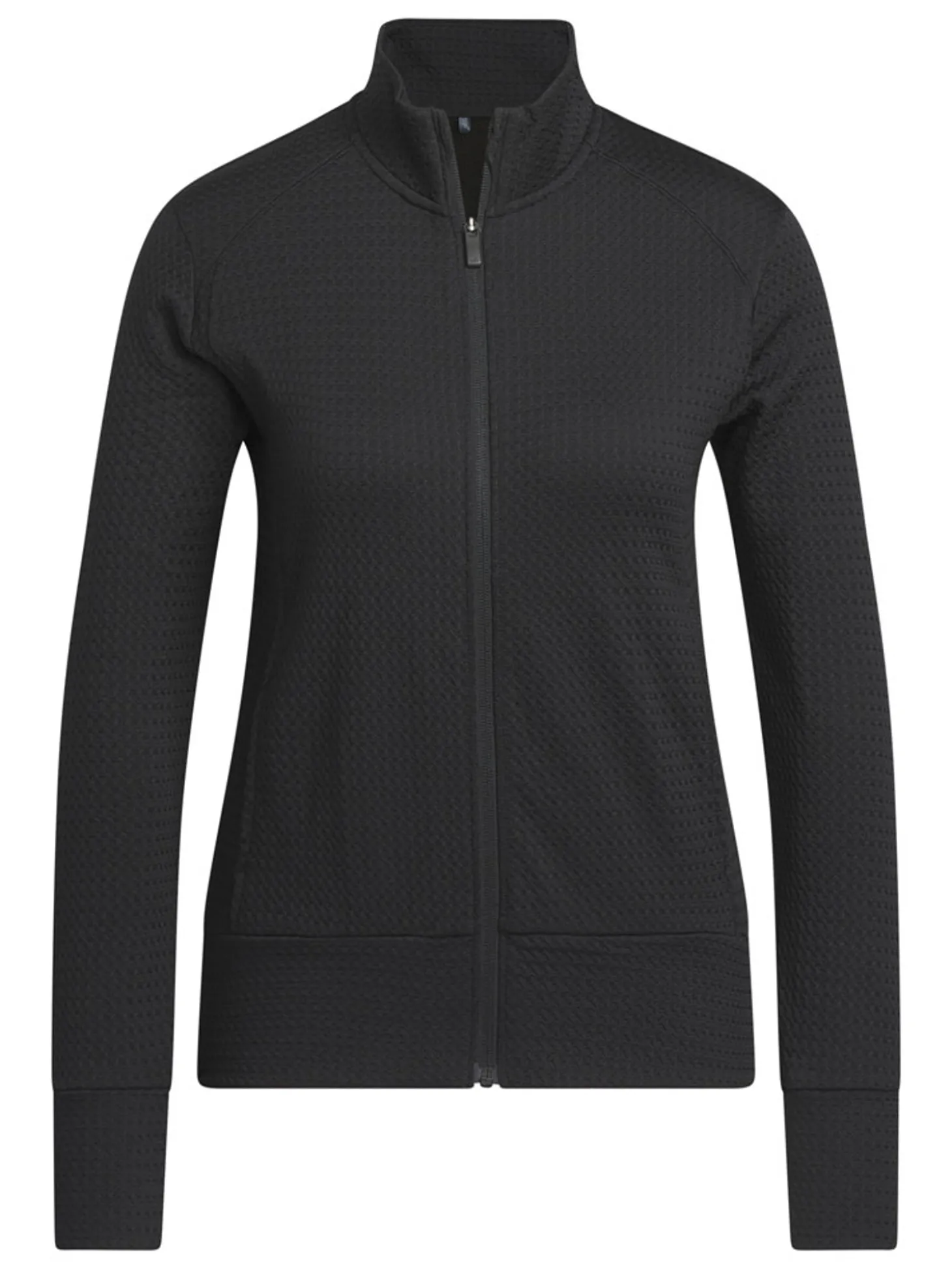 The adidas Womens Ultimate365 Texture Jacket (Black) features waffle-knit panels for breathability and zip pockets to stash your essentials. Whether teeing off or putting for par, its stretch fabric offers full mobility to play your best.