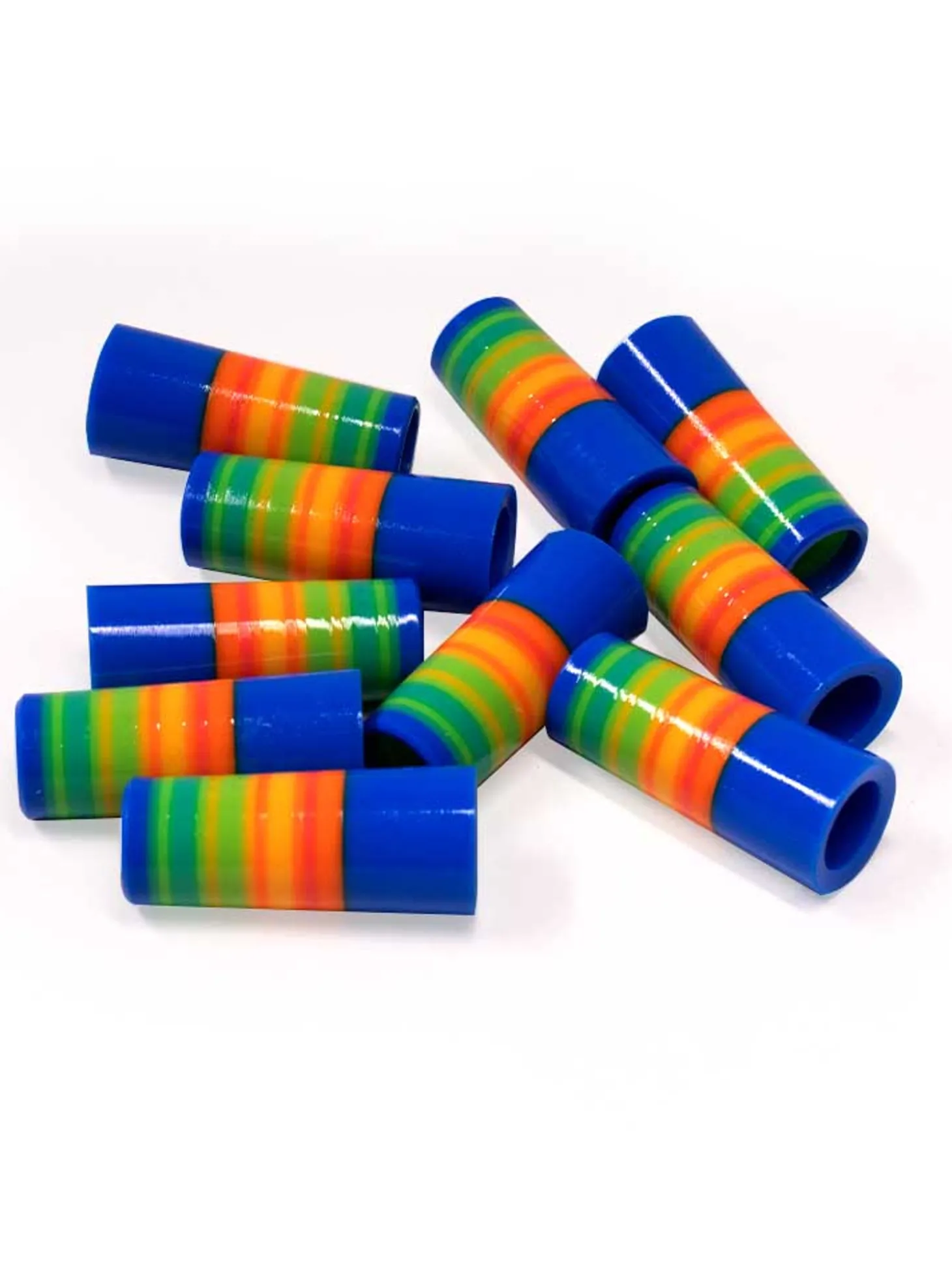 The BB&F Co Ferrule 1.3″ – Shave Ice (10 Pack) features a blue body with medium size lime and blue band at the top and smaller orange rings throughout.