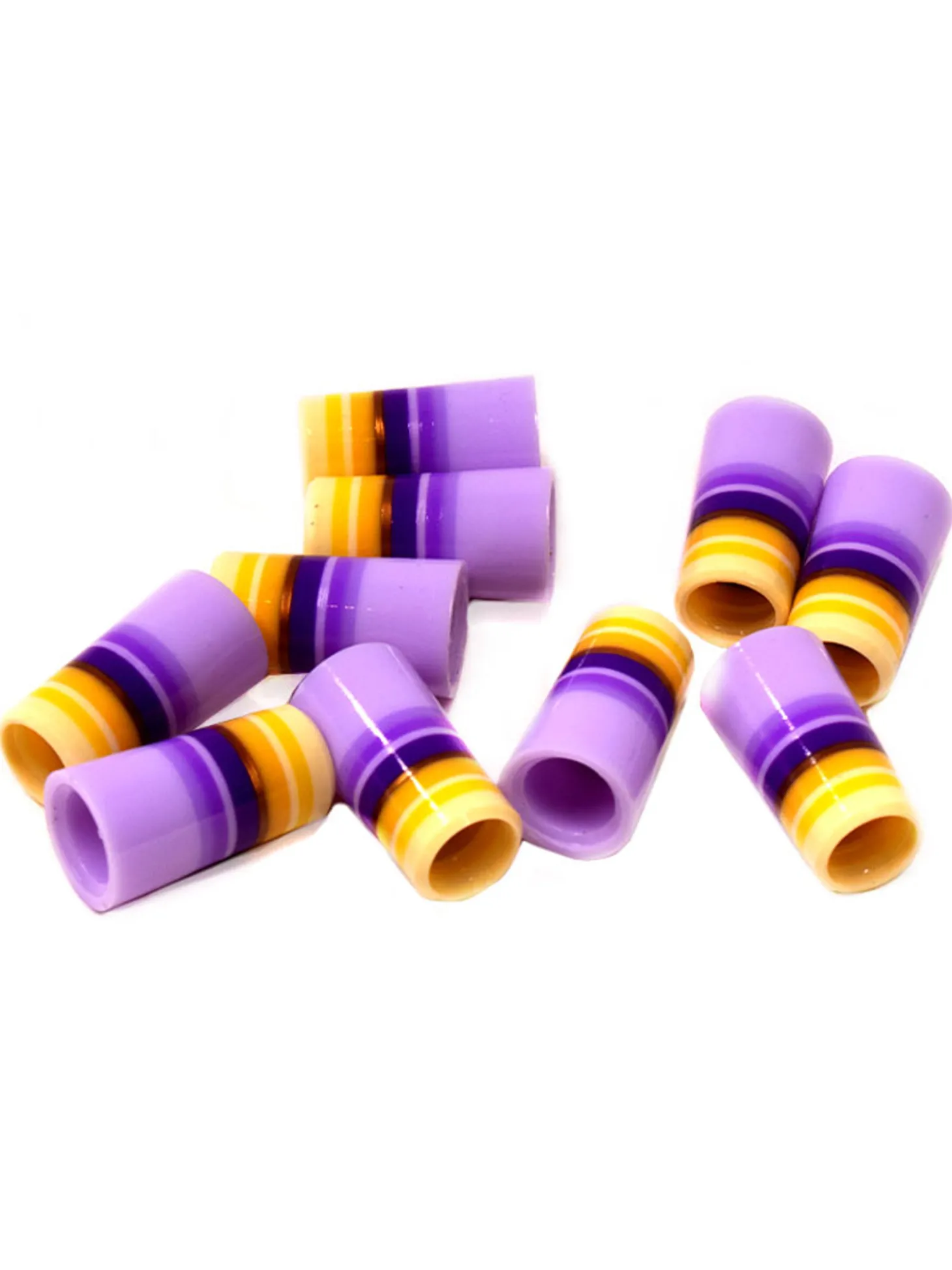 The BB&F Co Ferrule 1.3″ – The Delicate Sound Of Purple (10 Pack) features a lavender body with medium size yellow band at the top and smaller purple and dark yellow rings throughout.