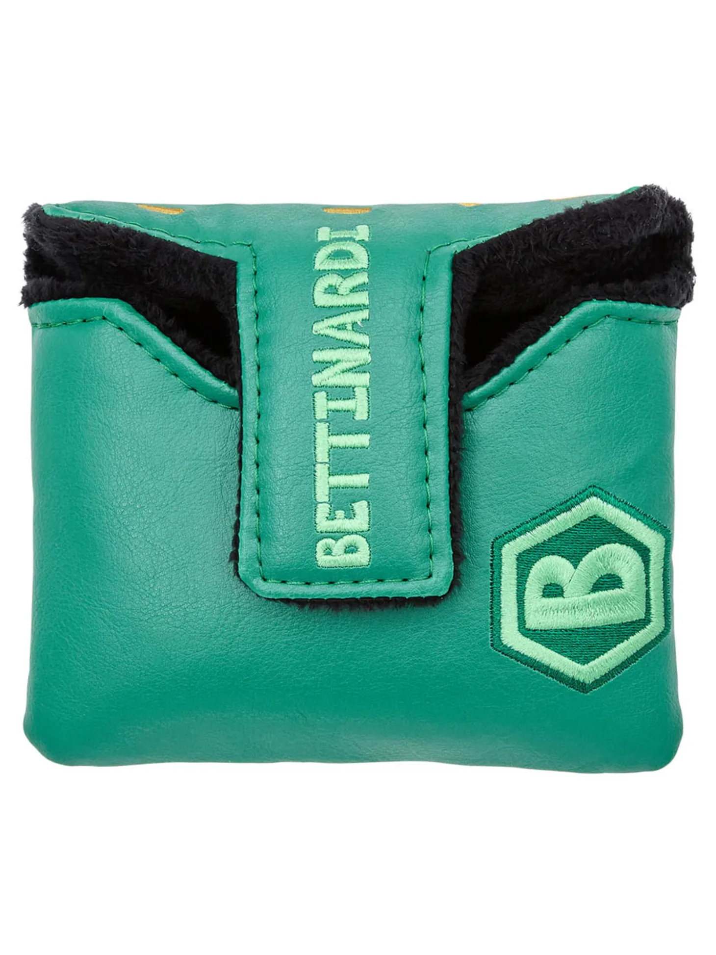 - Stitched on a green and gold base and finished with a magnetic closure and black plush interior to keep your putter protected.