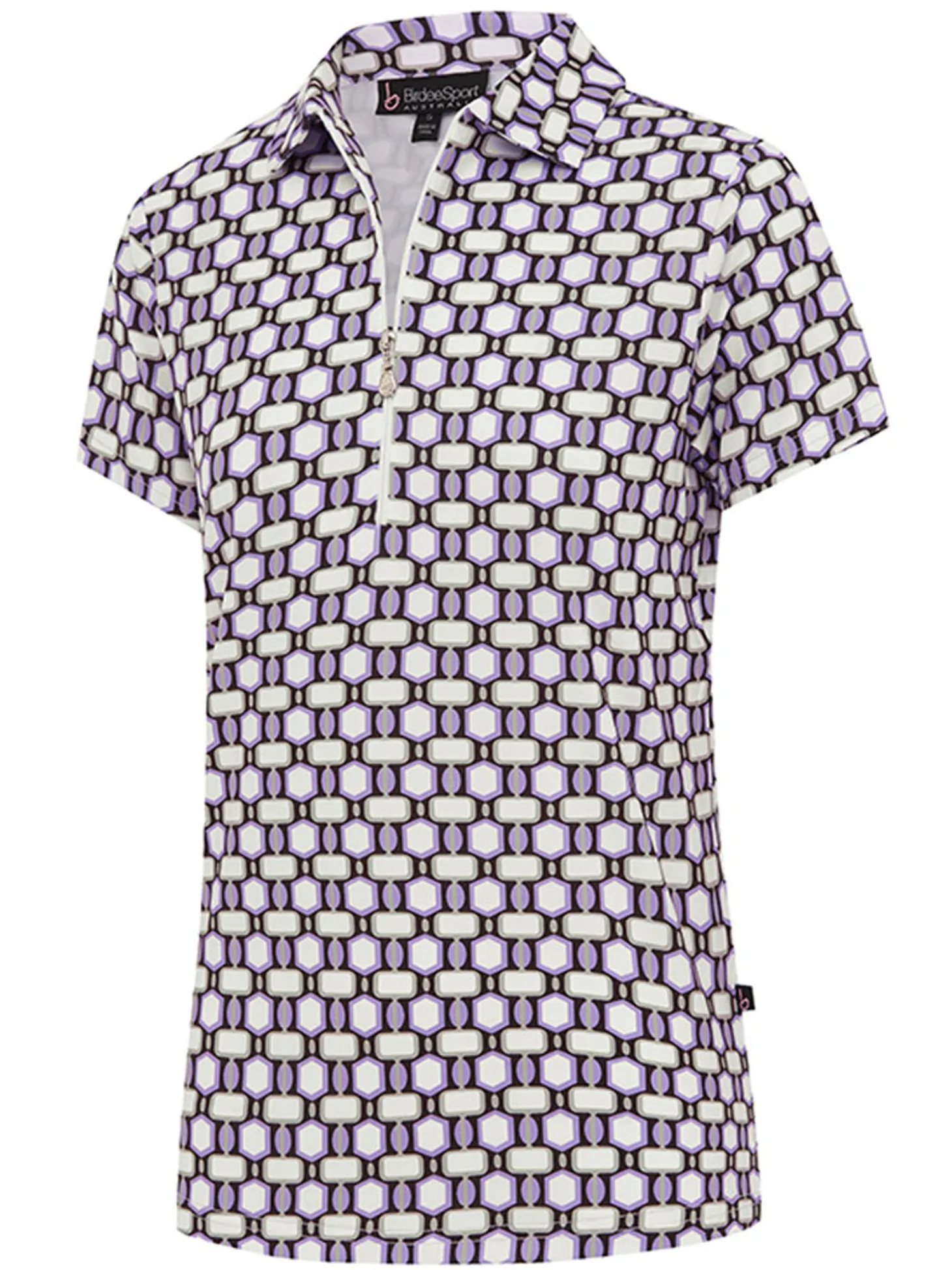 The Birdee Sport Women’s Astra Zipper Short Sleeve Top (White Lilac) provides effortless style and comfort with its all-over retro geometric pattern.