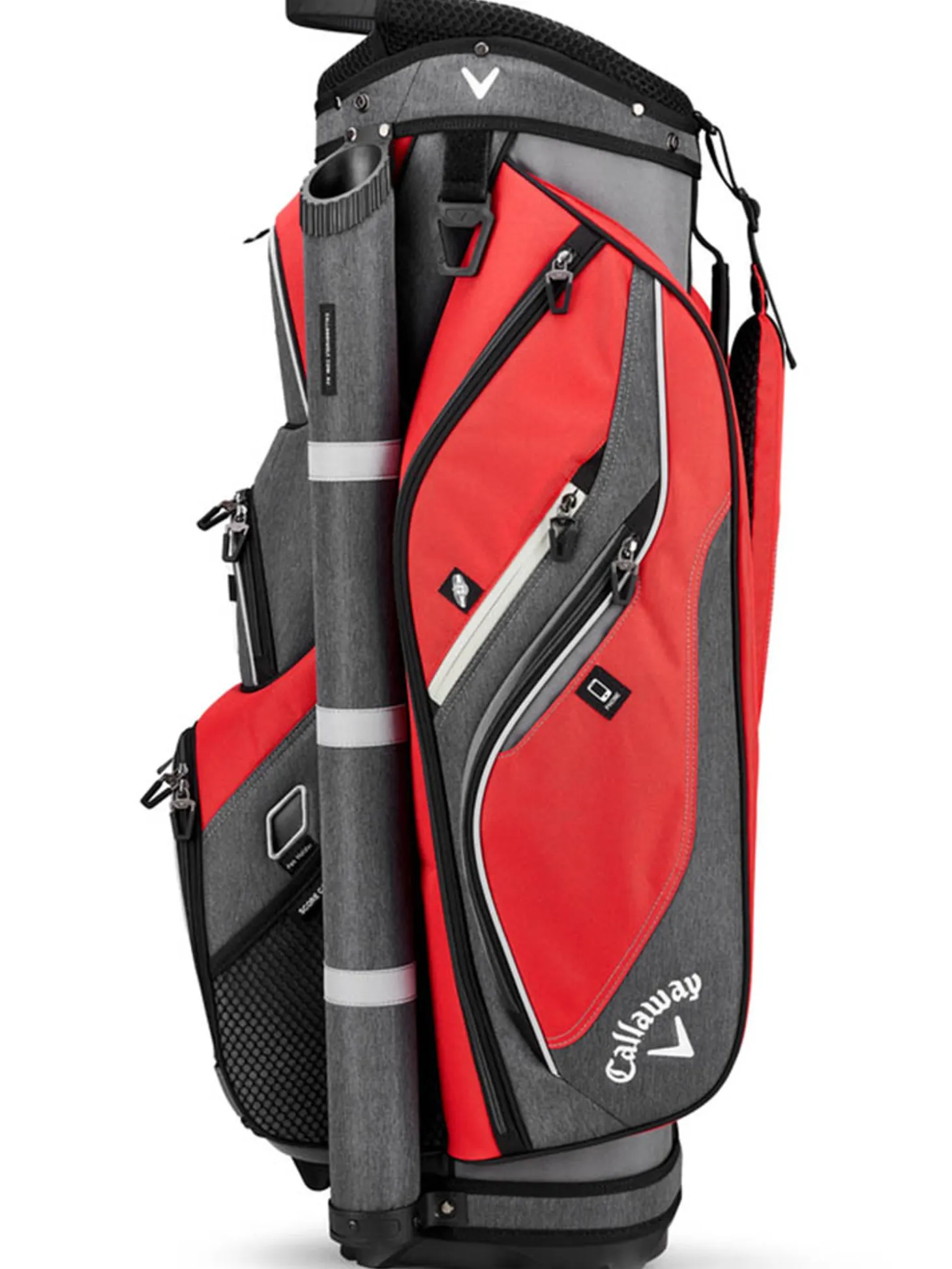 The Callaway Forrester 19 Cart Bag (Red) is designed to hold anything you would ever need on the golf course and keep it organised. Featured pockets include a strategically placed sunglass and cell phone pocket, a velour-lined waterproof valuables pocket, and a thermal-lined cooler pocket large enough to get you through a whole round. A hidden pocket on the bottom conceals a full-sized rain cover for those harsh weather days.