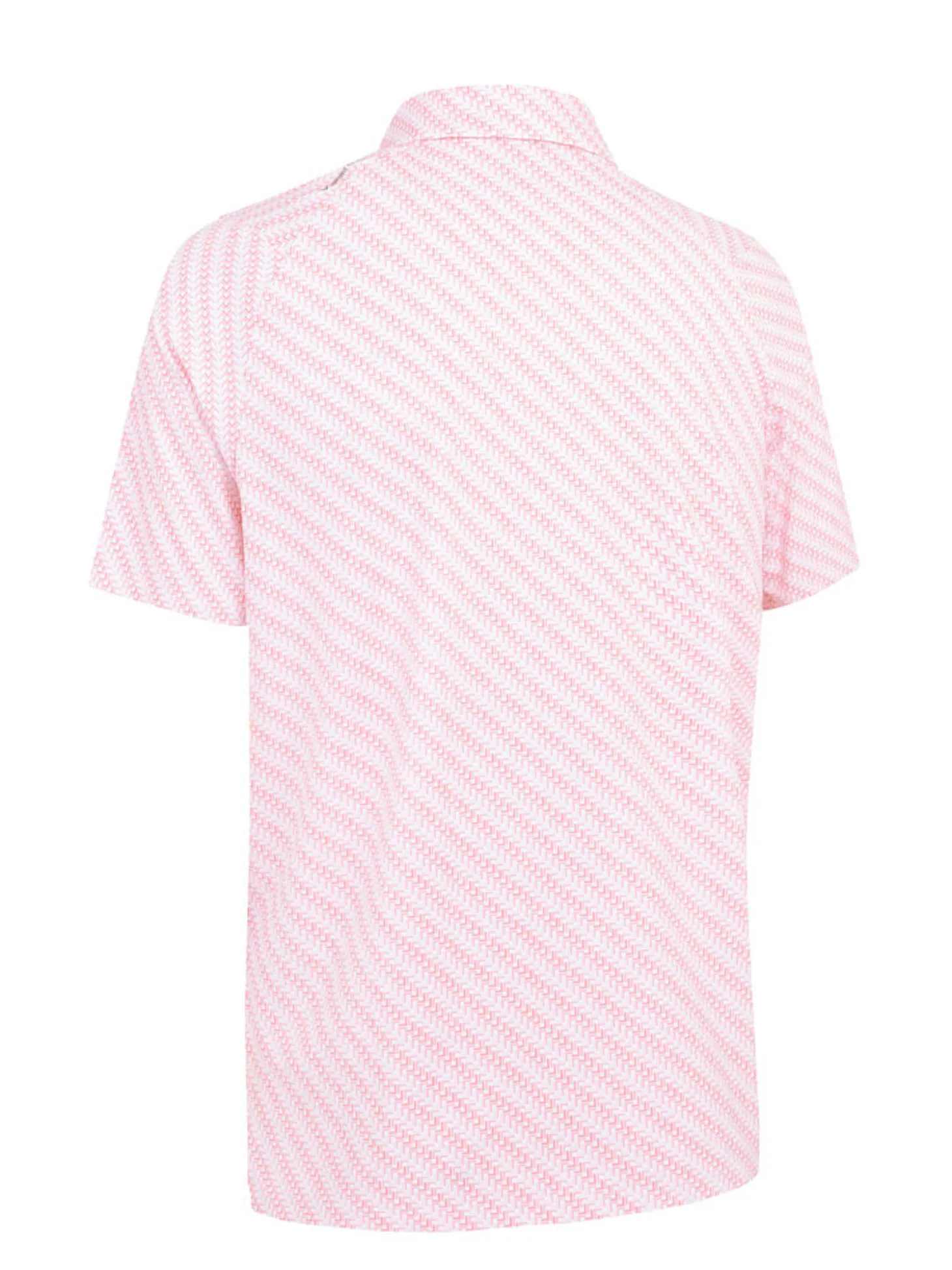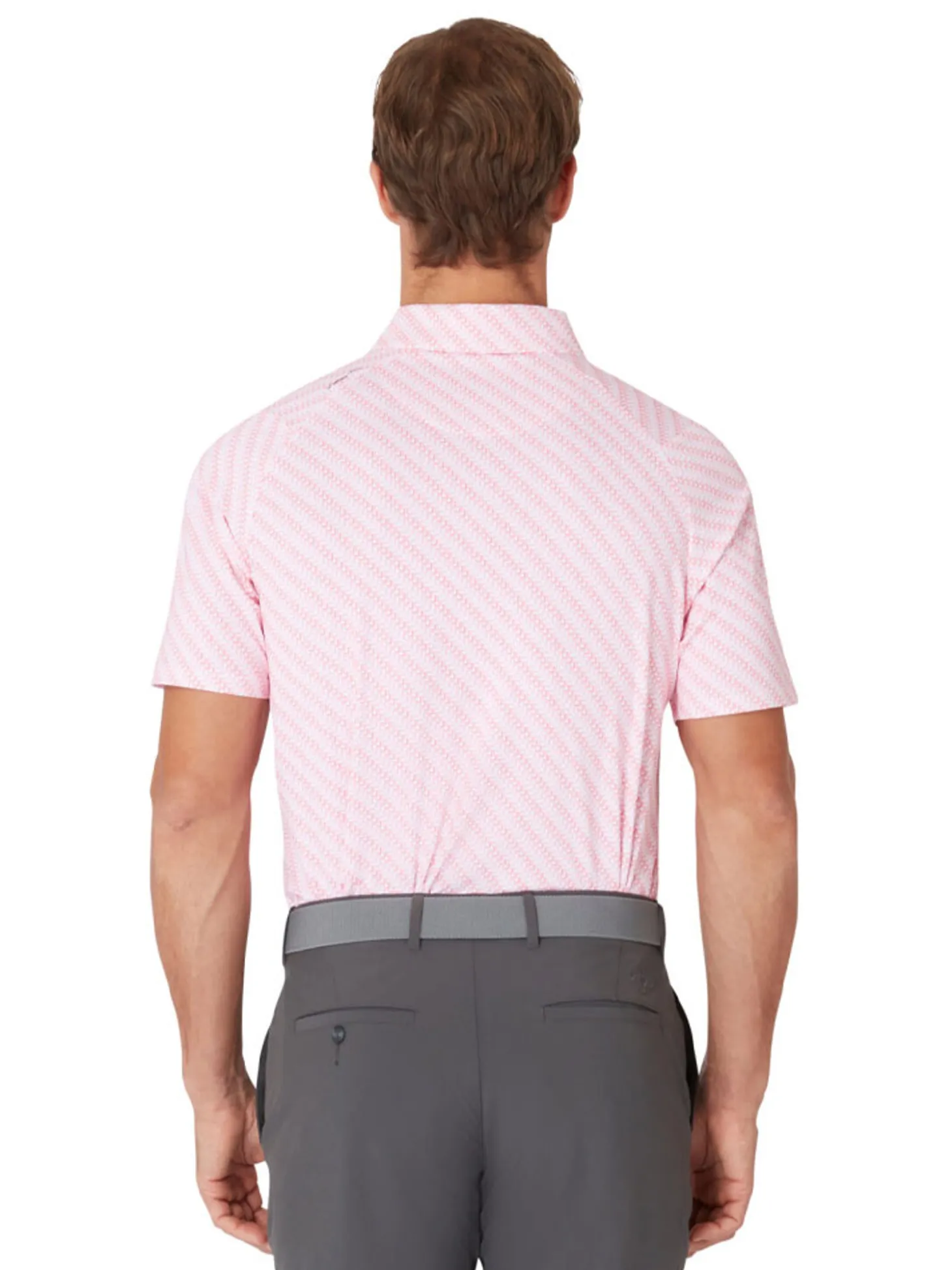 The Callaway Twill Print Polo (Pink) will let you stay comfortable and stylish on the course. The chevron print adds a striking touch for eye-catching style you can don for your next round or as everyday casual wear.