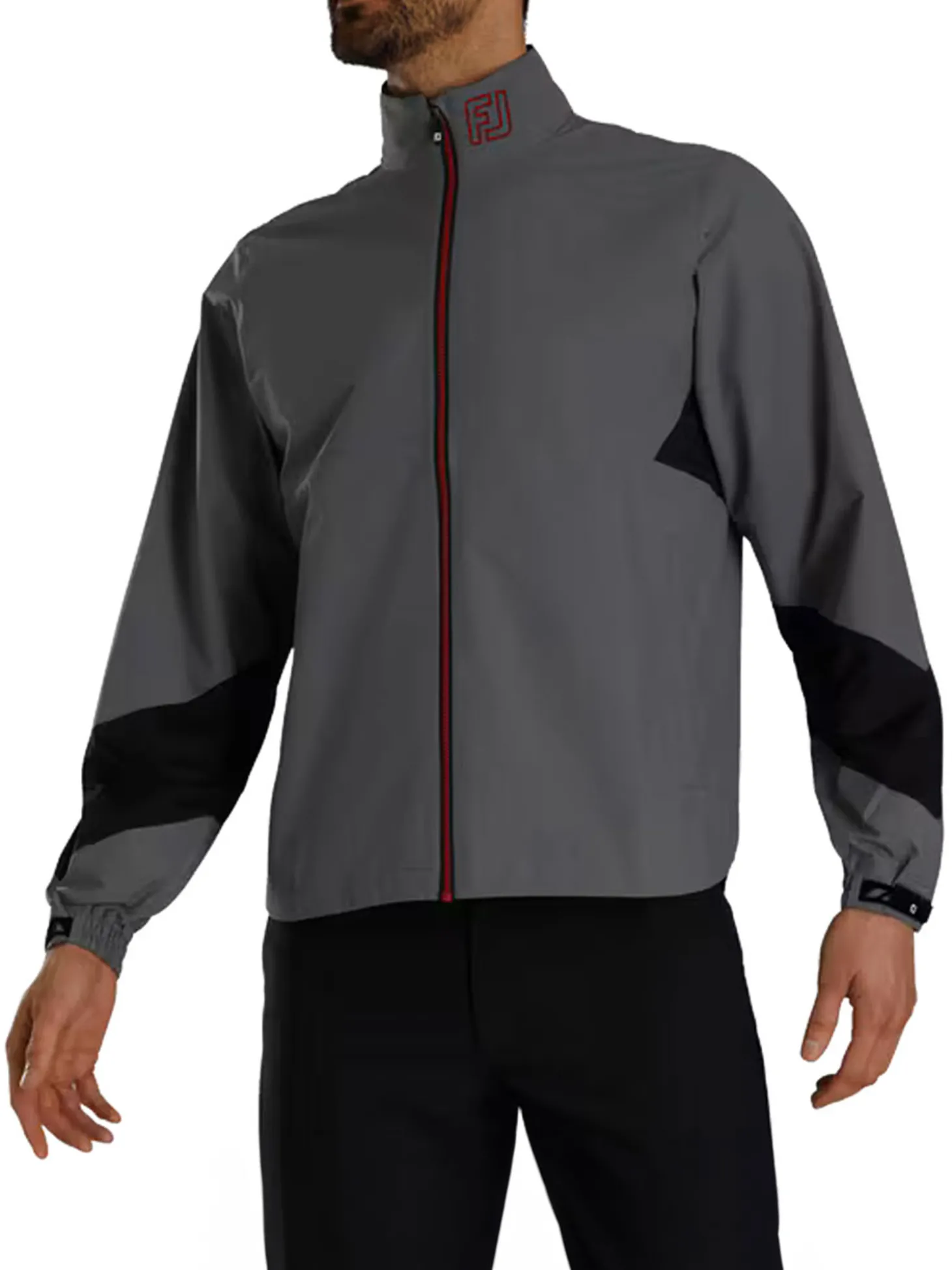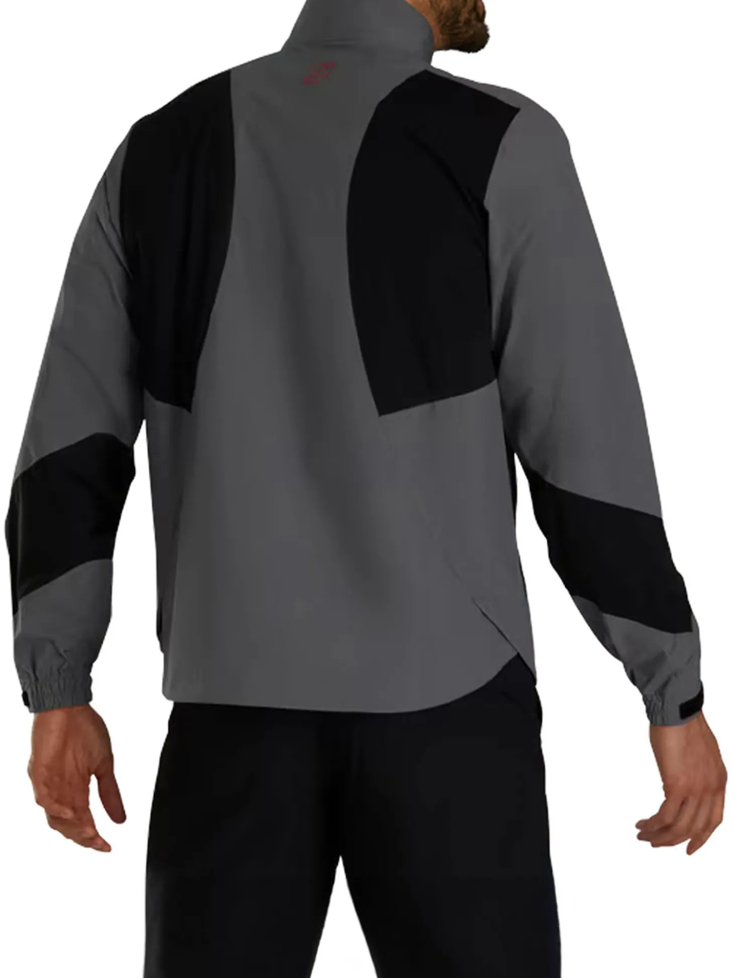 The FootJoy HydroLite X Rain Jacket (Charcoal) is designed for warmer playing conditions with specifically placed knit panels in arms and back for increased movement and flexibility in the golf swing.