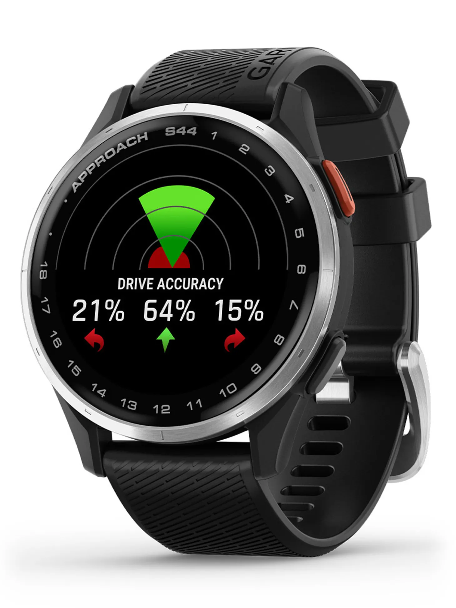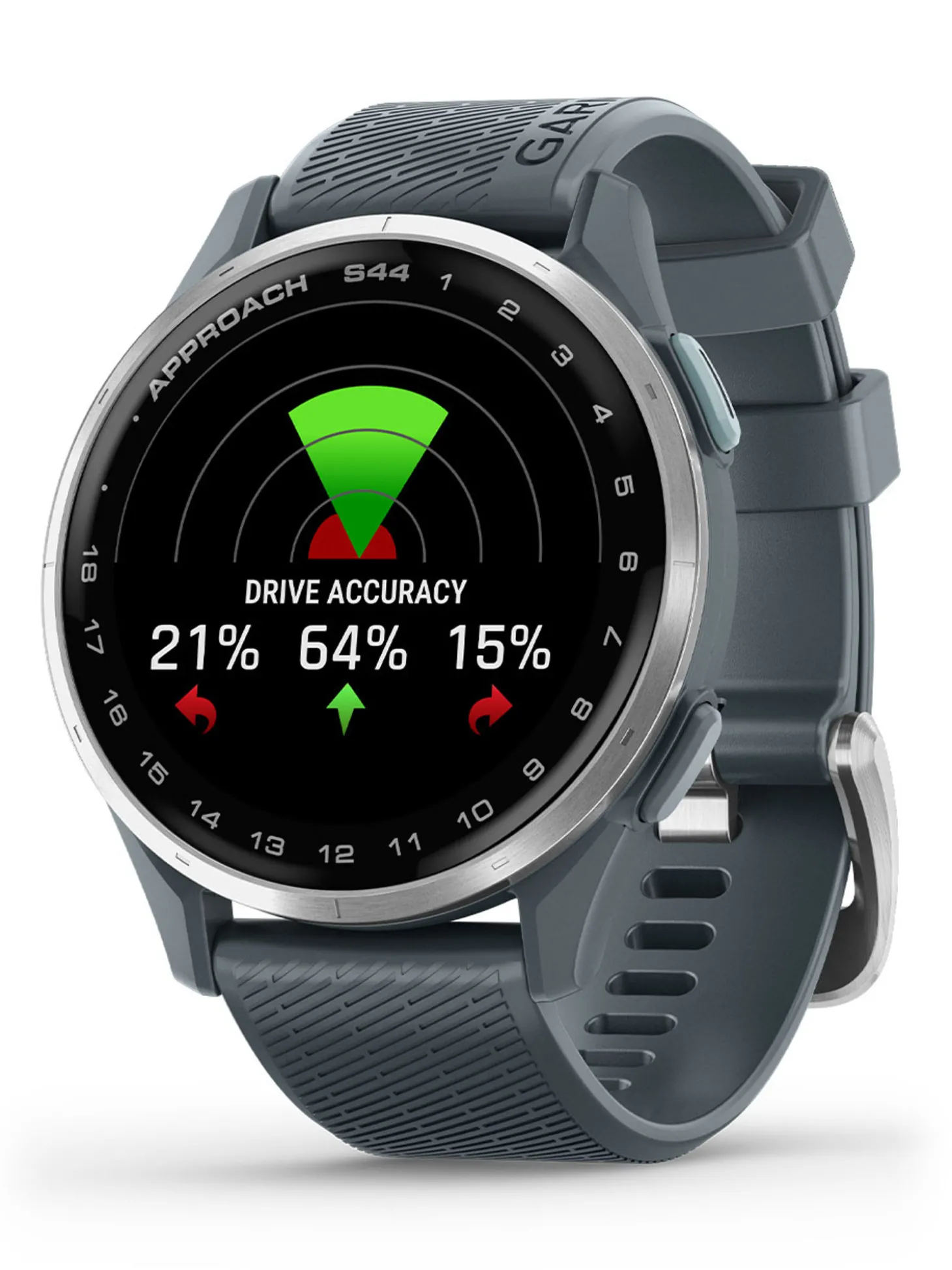 The Garmin Approach S44 GPS gives you what you need on the course and beyond. The slim, lightweight golf watches feature a bright 1.2″ AMOLED display that makes it easy to see key yardages to the green, hazards, and doglegs on 43,000+ preloaded courses worldwide.