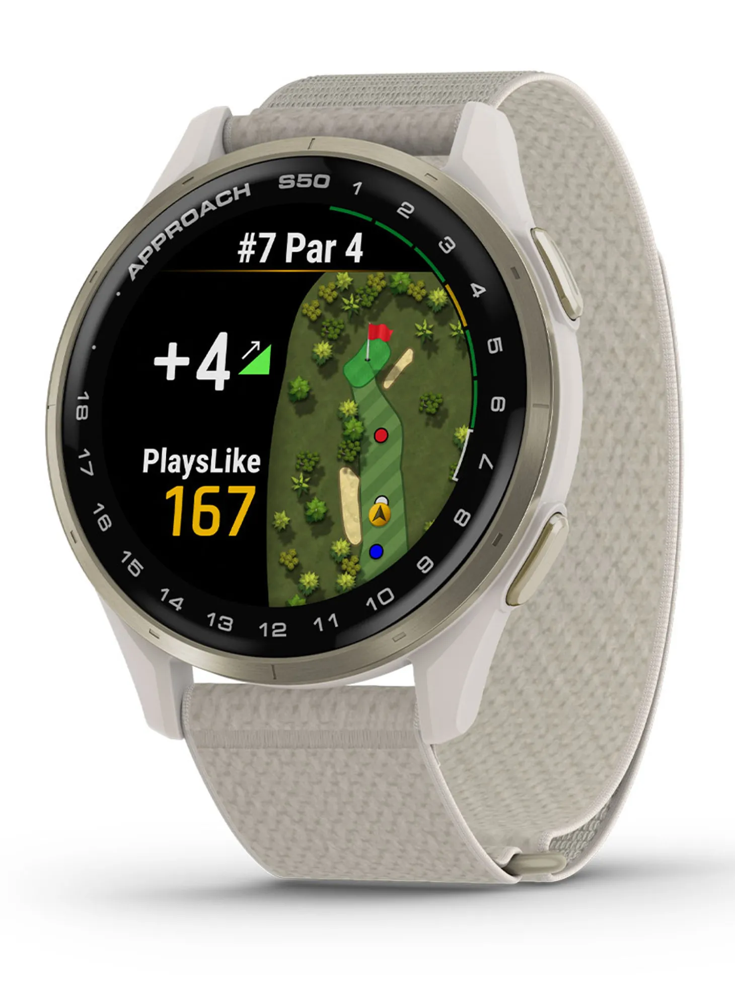 The Garmin Approach S50 GPS gives you what you need on the course and beyond. The slim, lightweight golf watches feature a bright 1.2″ AMOLED display that makes it easy to see key yardages to the green, hazards, and doglegs on 43,000+ preloaded courses worldwide.