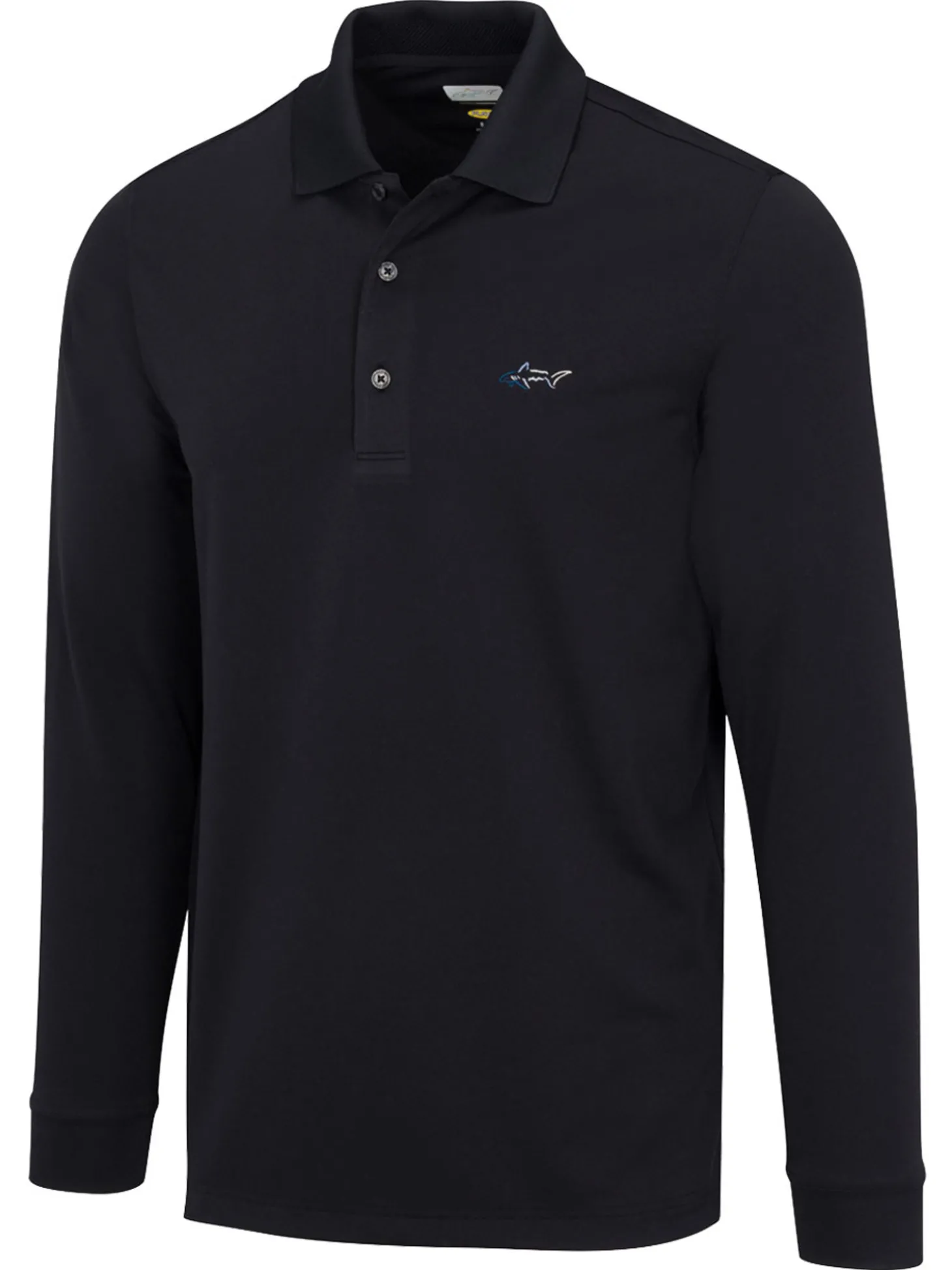 The Greg Norman Long Sleeve Pique Shark Polo (Black) is crafted from a breathable pique polyester fabric featuring moisture-wicking PLAY DRY technology, capped off with a knit collar and signature embroidered Shark logo on left chest.