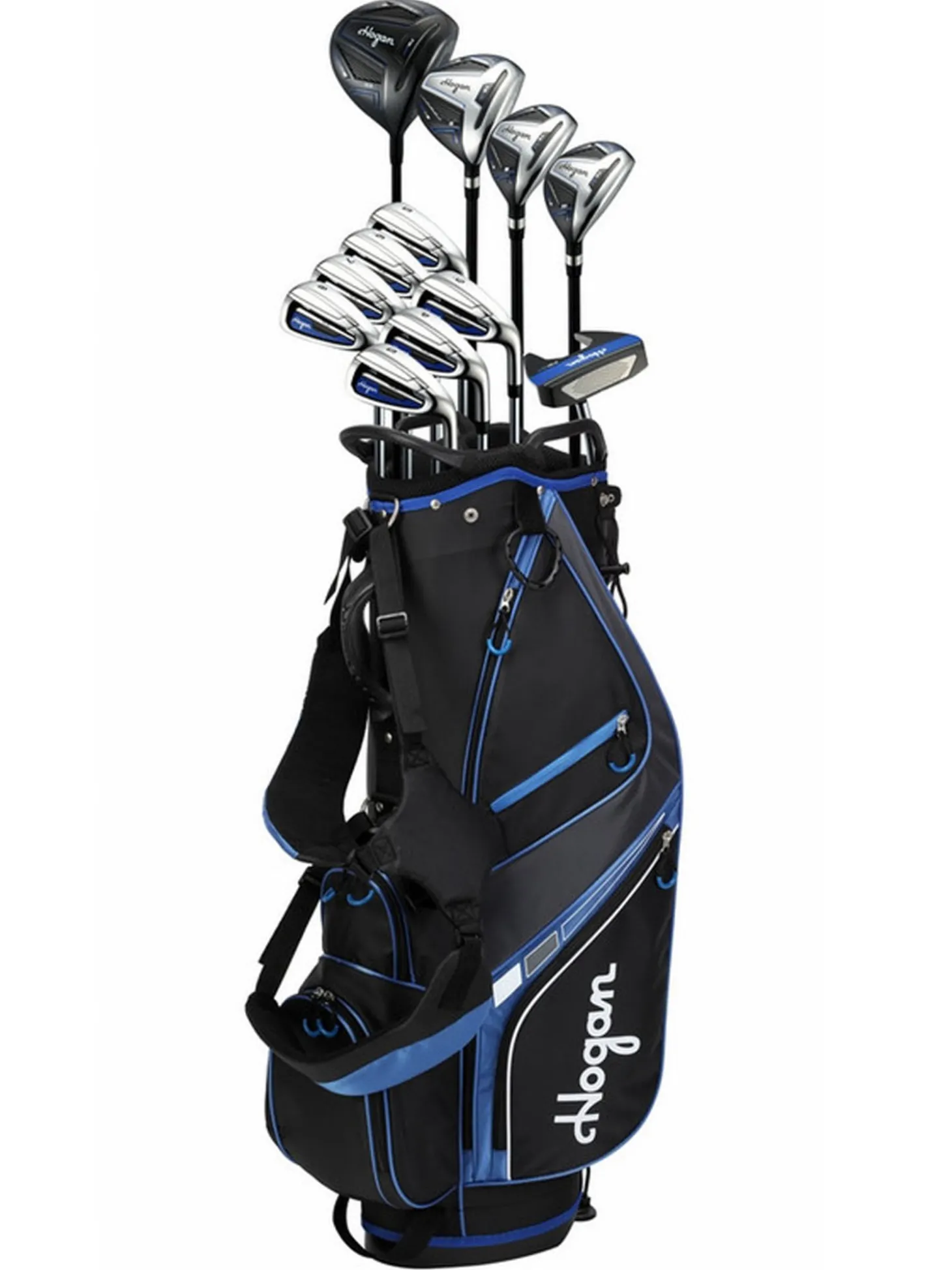 The Hogan FW-817 Package (Steel Shaft) has a driver, wood, hybrid, putter, and irons that come with a stand bag.