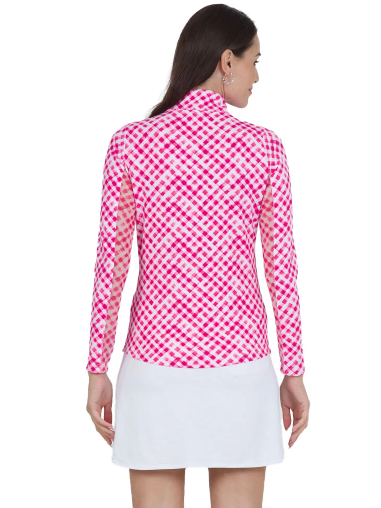 The IBKUL Gingham Check Long Sleeve Mock Neck Top (Pink) is designed with an all-over print in the brand’s patented iceƒil technology and mesh underarm panels that give you extra style, reach, and breathability.