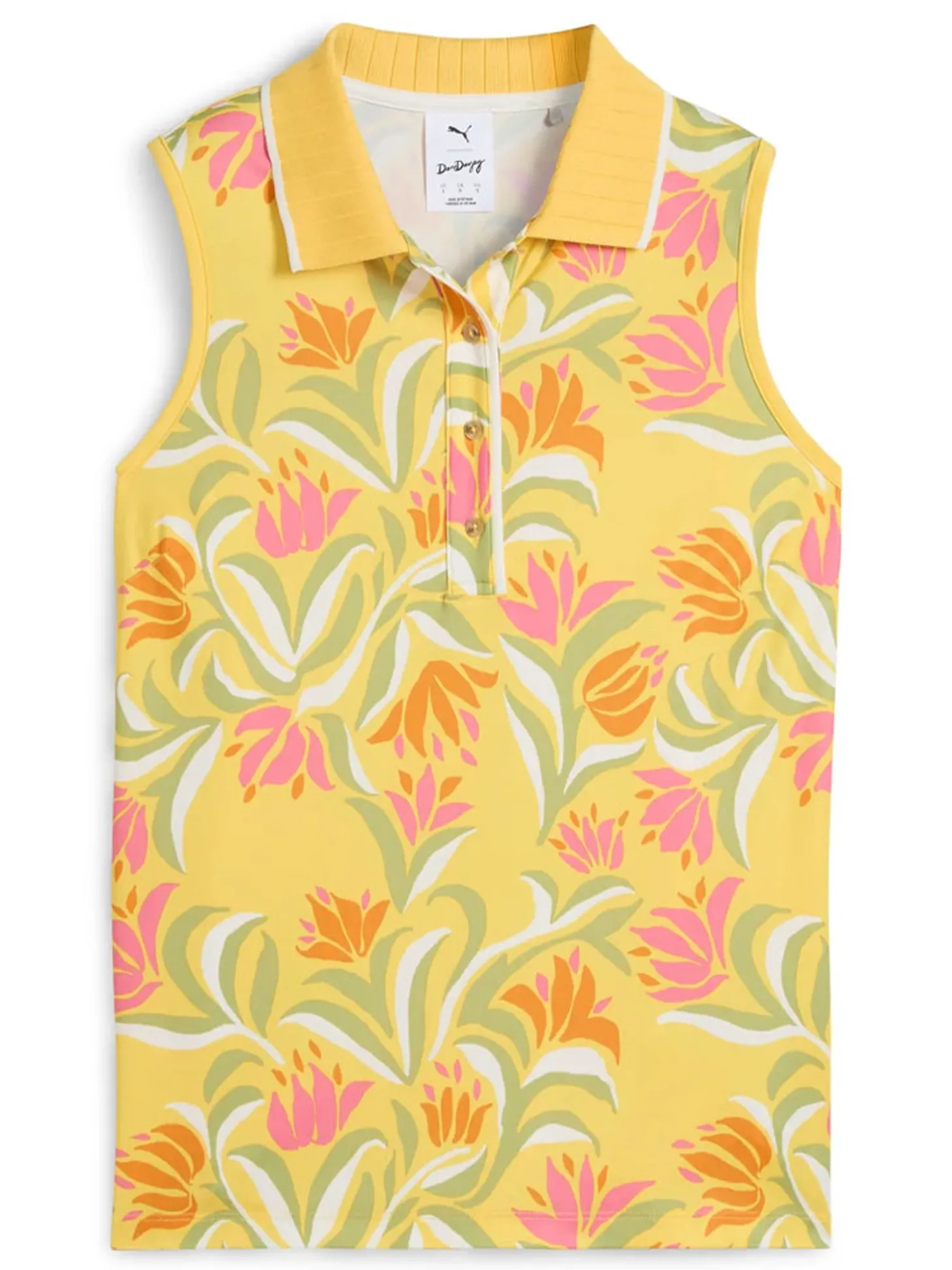 The Puma Womens x Dani Dazey Sleeveless Polo (Yellow) lets you enjoy cool-girl golf style. Based in LA, maximalist designer Dani Dazey brings her unique fashion sense to this special collection of women’s gear that includes dresses, skirts, shoes and more. This golf polo features our moisture-wicking dryCELL tech and a regular, sleeveless fit.
