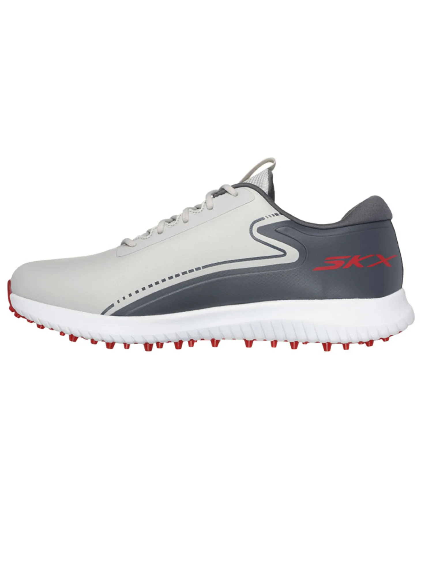 The Skechers GO GOLF Max 3 Golf Shoes (Grey) features a lace-up waterproof synthetic leather upper with protective hotmelt overlays, removable Arch Fit insole, lightweight ULTRA FLIGHT cushioning and spikeless outsole.