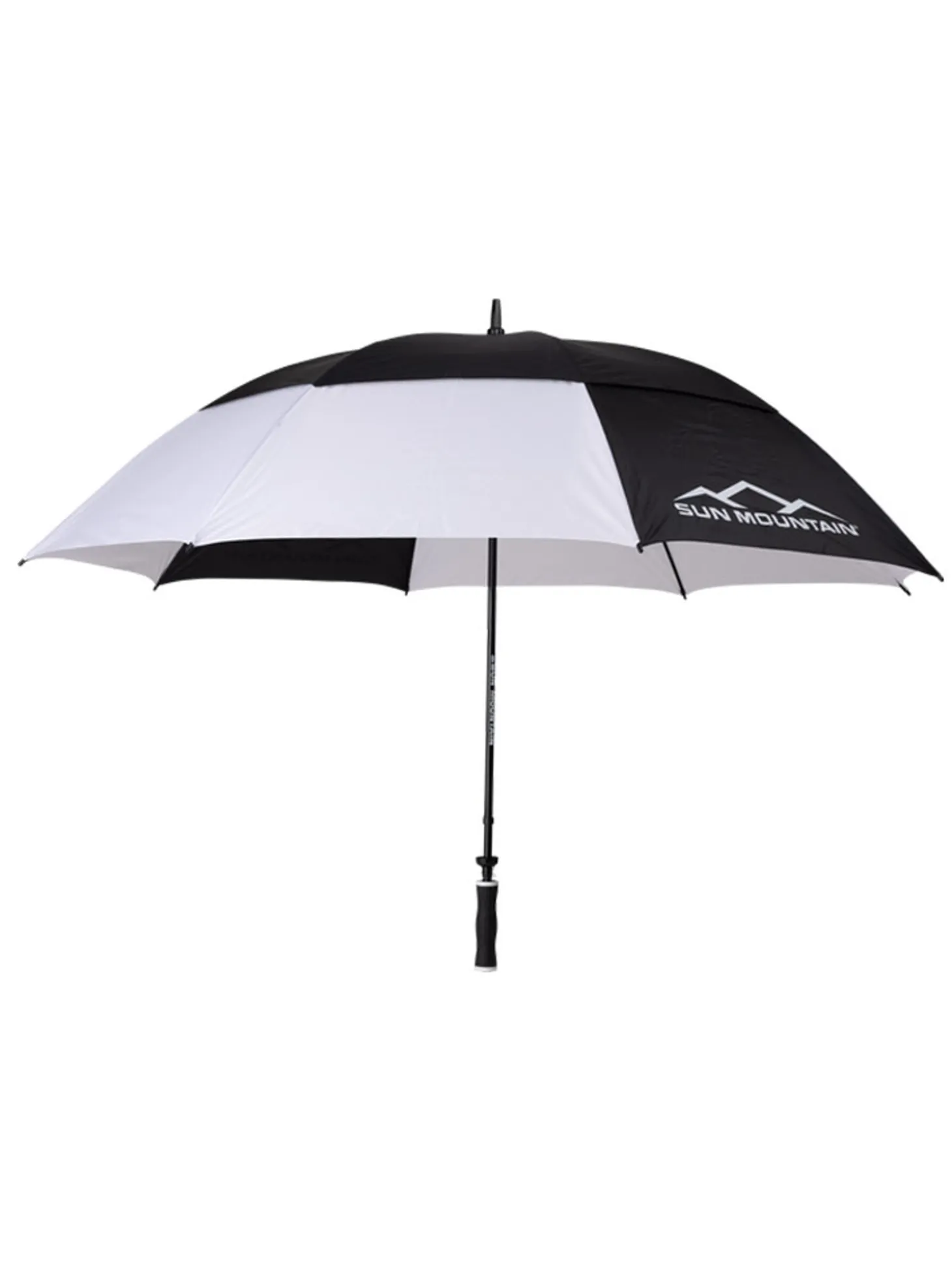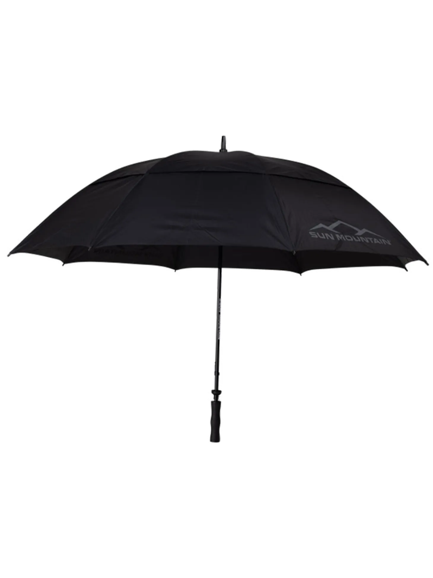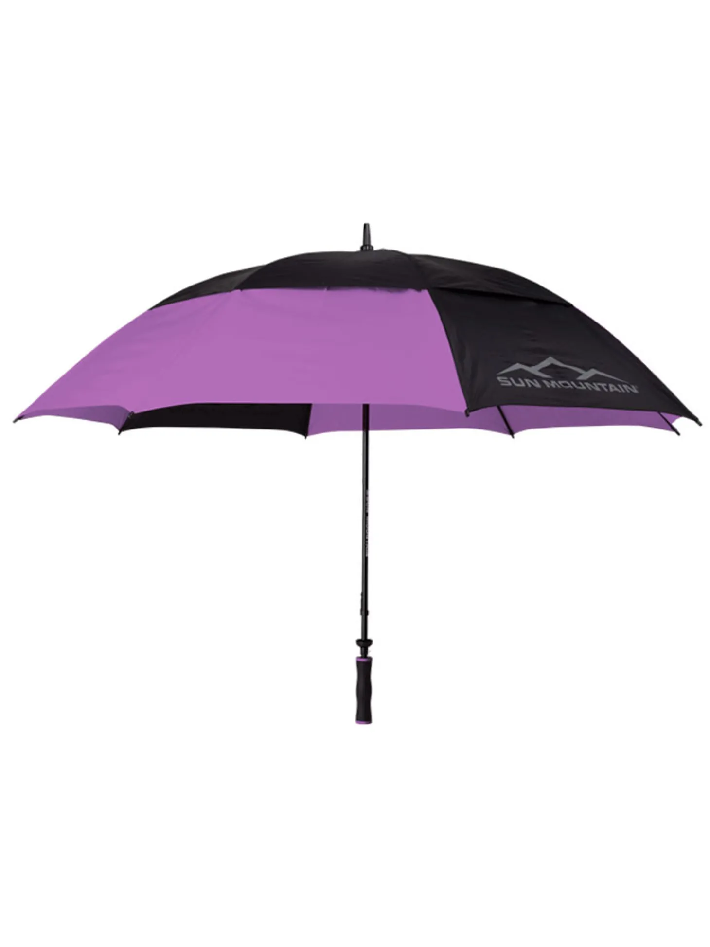 The Sun Mountain 25 UV Umbrella is equipped with auto-operation and a double canopy for maximum coverage in both rain and sunshine. The rubber-covered handle is slip-resistant and fits perfectly in Sun Mountain cart umbrella holders.