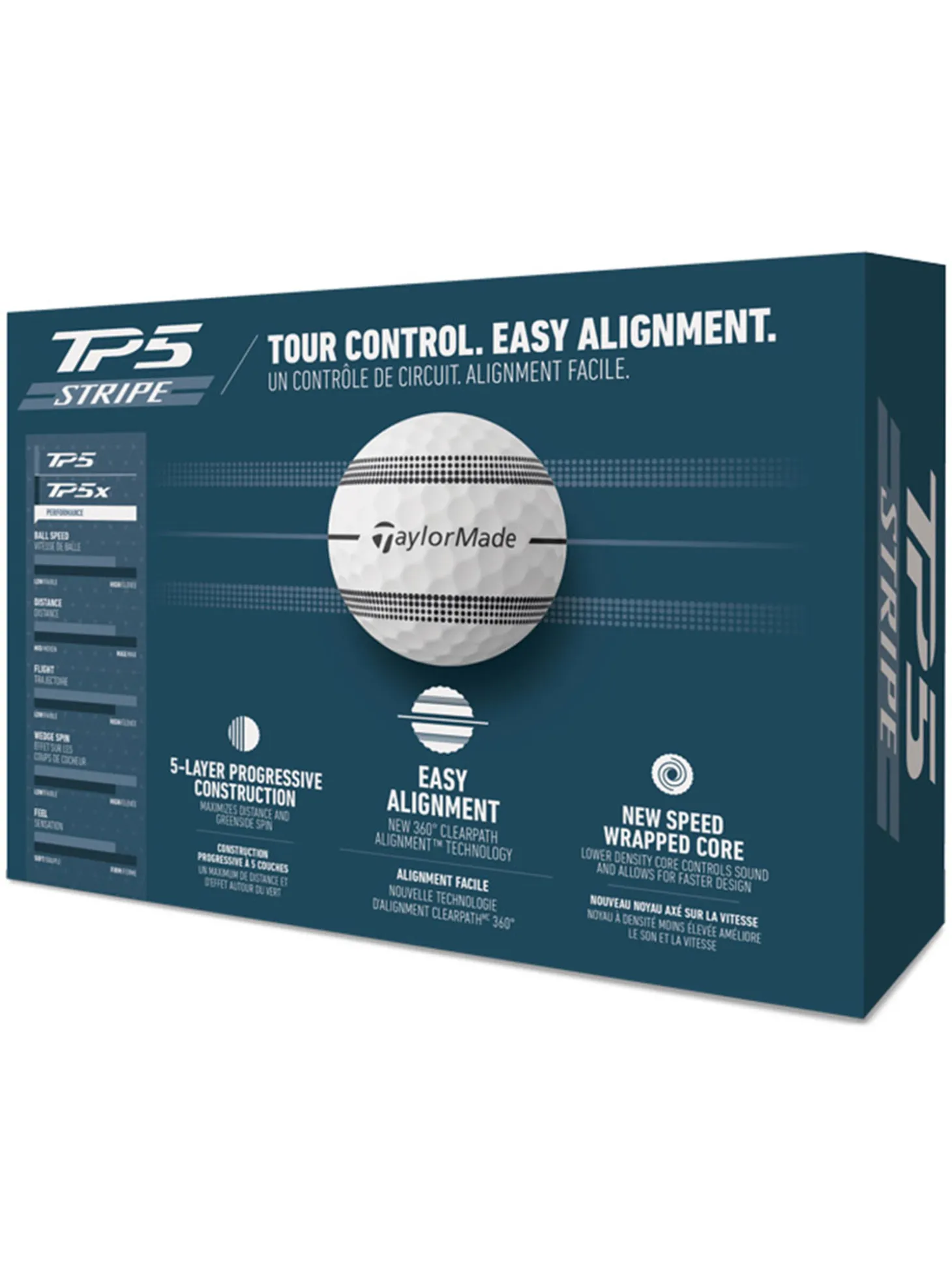 The TaylorMade TP5 Stripe Golf Balls feature a Speed Wrapped Core and five layers of Progressive Speed Construction. The soft urethane cover delivers exceptional greenside spin and responsive feel while minimising driver spin. Now with 360° ClearPath Alignment, lining up at the target on the green and off the tee has never been easier.
