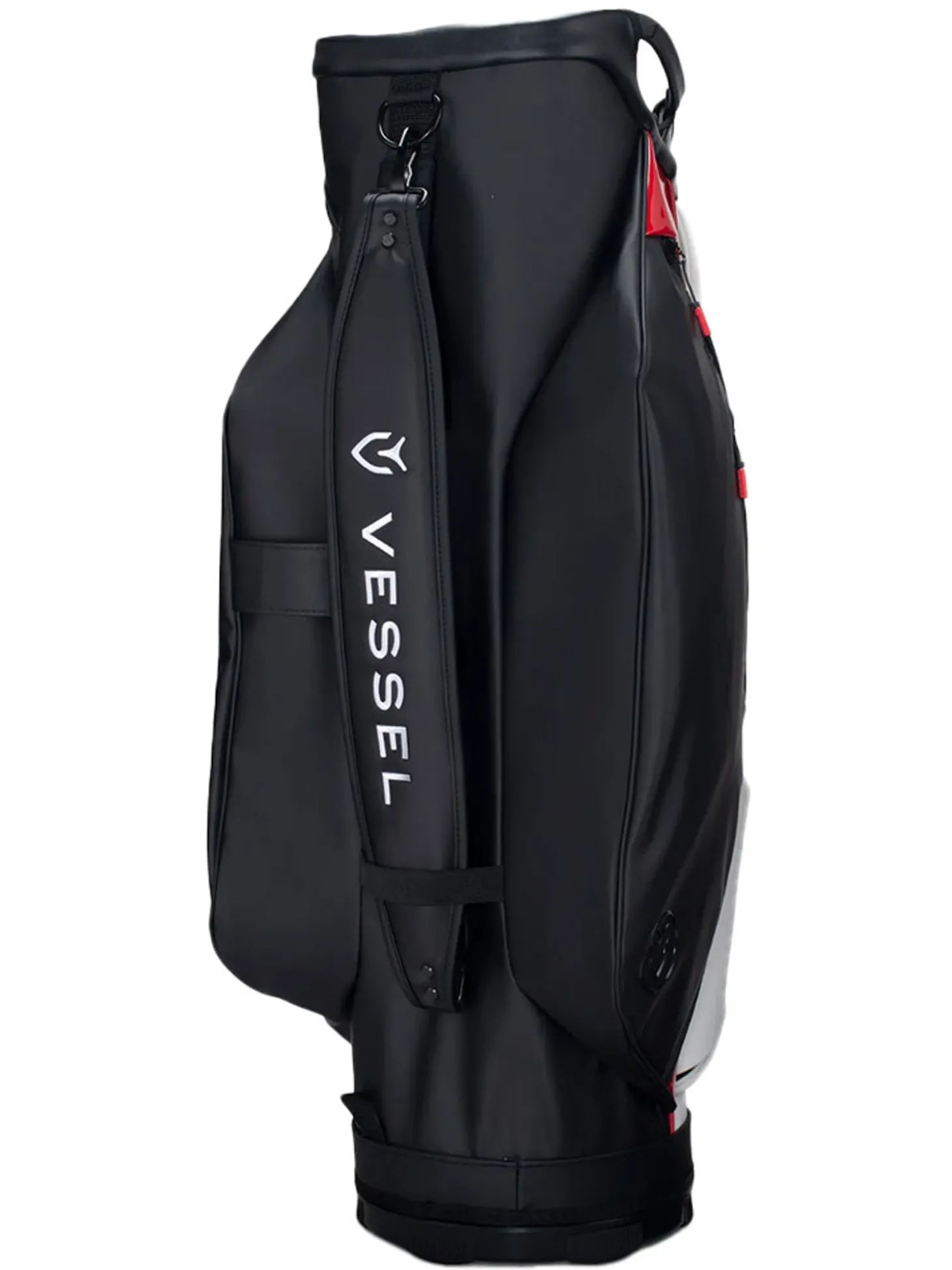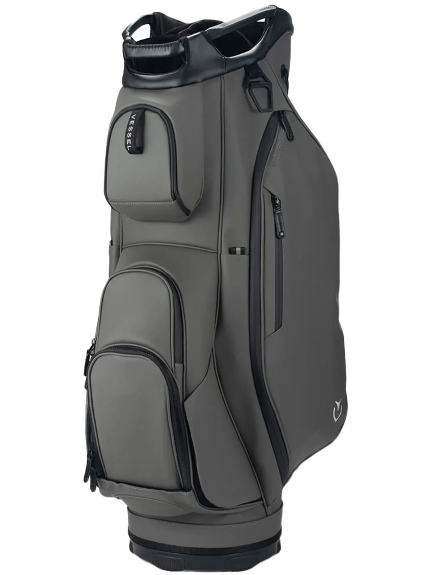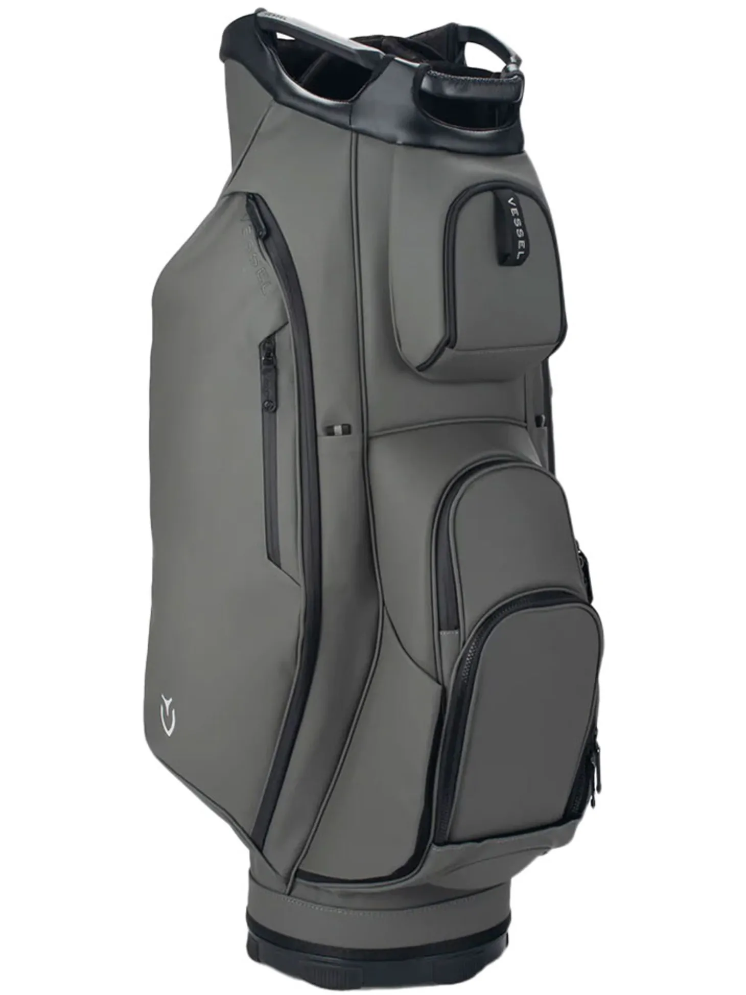 The Vessel Lux Cart bag was intentionally designed to give you a premium riding experience. Starting with 2 forward-facing pockets and an upper pocket pod that swings over the cart strap and snaps down with a magnetic closure, securing your bag in place without restricting access to essentials while on a cart. With two antimicrobial lined personals pockets and a lockable valuables pocket, this cart bag offers plenty of storage for your valuables. Two carry handles and a padded single strap are included for a comfortable carry from the golf cart to the car.Dual water bottle sleeves and a large cooler-lined compartment, fit plenty of beverages for a full round. Both top sizes feature a dedicated putter well and microfiber-lined dividers for optimal club storage. Crafted with our signature attention to detail, the Lux Cart boasts genuine leather touchpoints, chrome finishes, and tour-grade body materials.