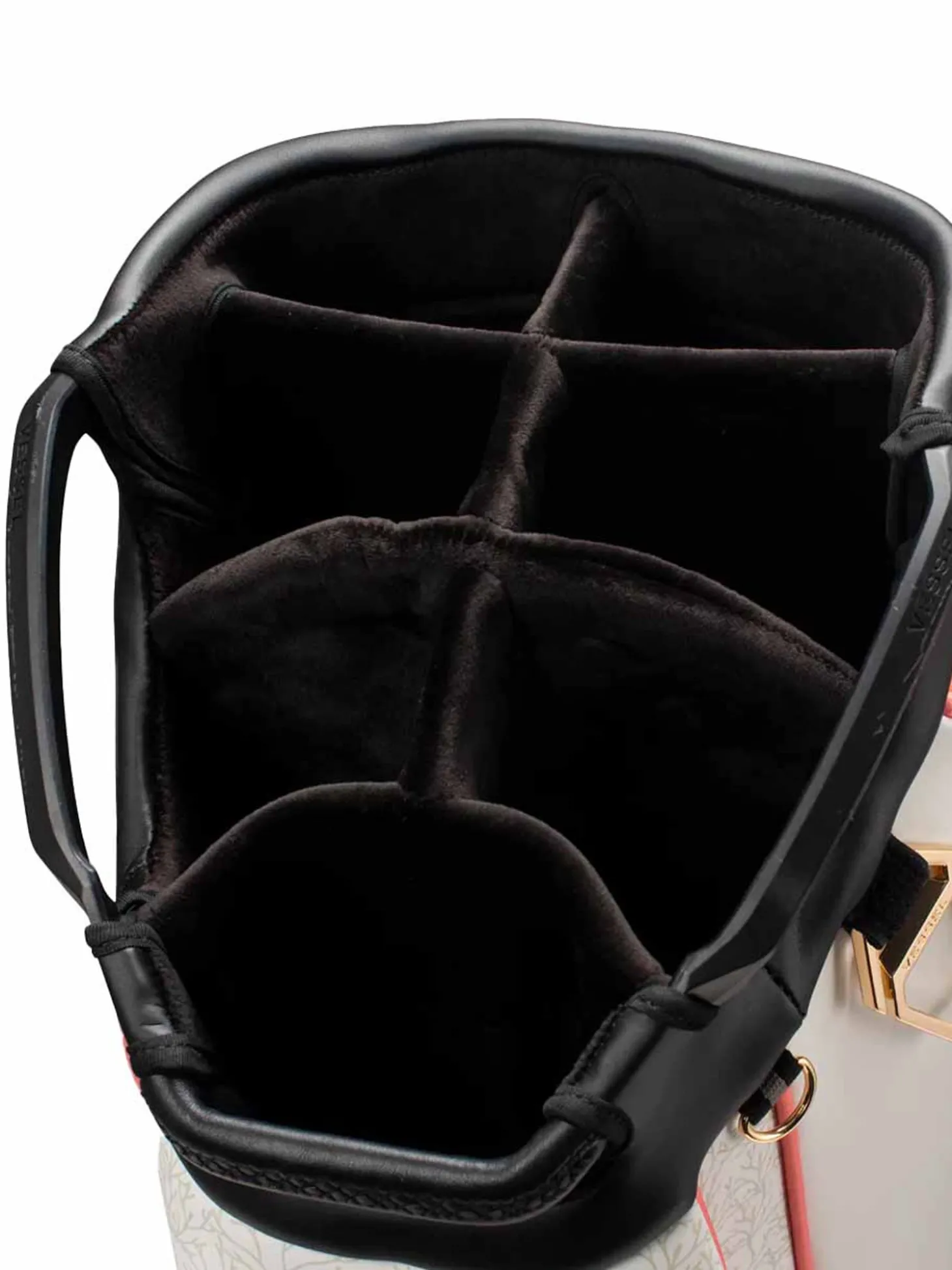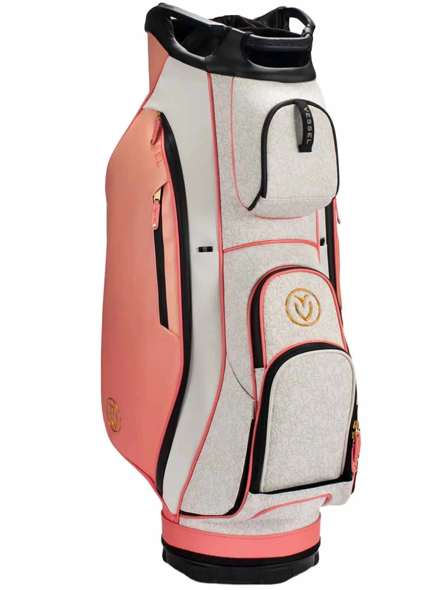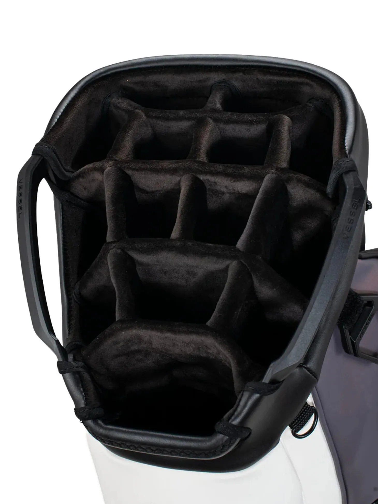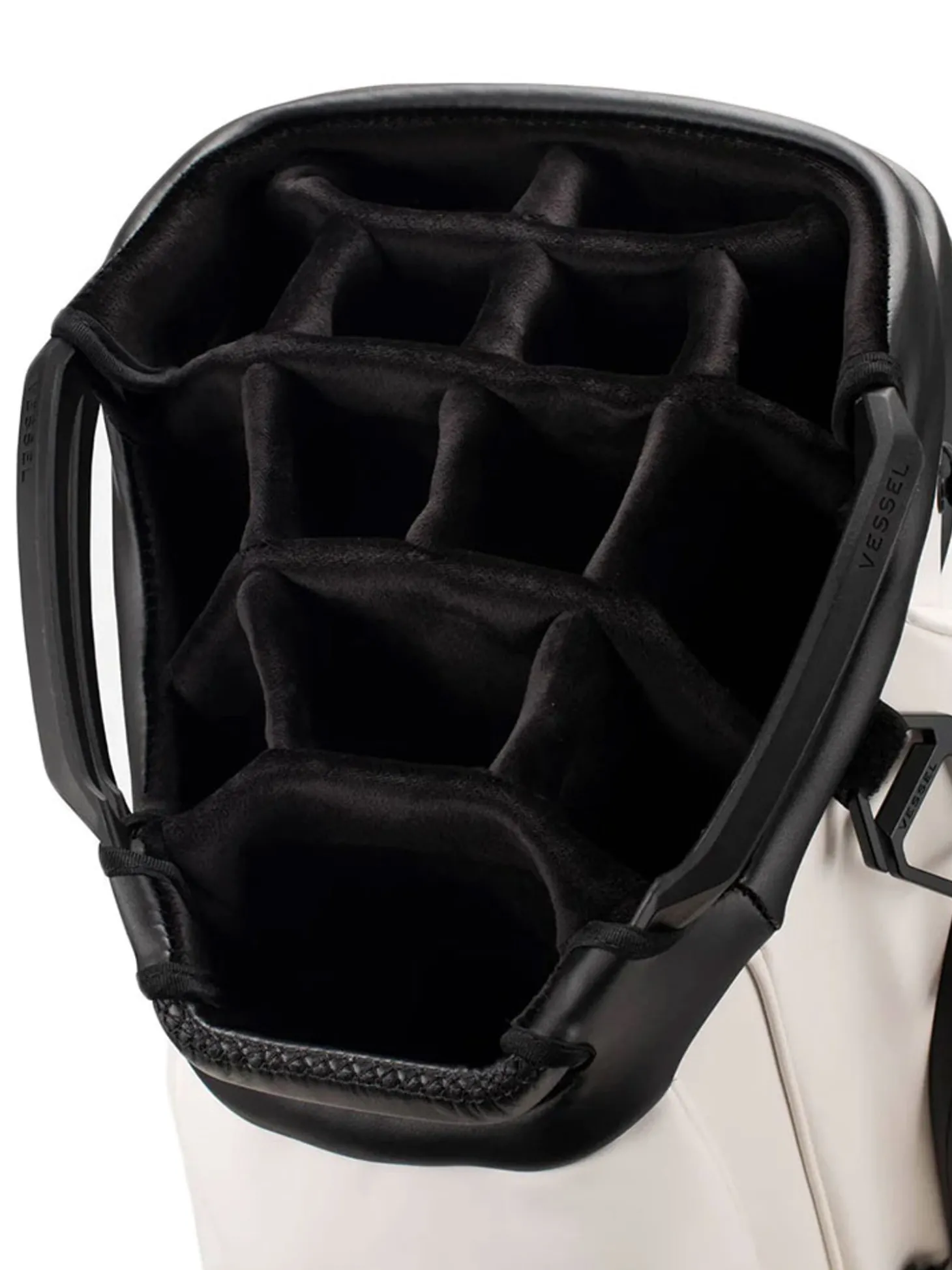 The Vessel Lux Cart bag was intentionally designed to give you a premium riding experience. Starting with 2 forward-facing pockets and an upper pocket pod that swings over the cart strap and snaps down with a magnetic closure, securing your bag in place without restricting access to essentials while on a cart. With two antimicrobial lined personals pockets and a lockable valuables pocket, this cart bag offers plenty of storage for your valuables. Two carry handles and a padded single strap are included for a comfortable carry from the golf cart to the car.Dual water bottle sleeves and a large cooler-lined compartment, fit plenty of beverages for a full round. Both top sizes feature a dedicated putter well and microfiber-lined dividers for optimal club storage. Crafted with our signature attention to detail, the Lux Cart boasts genuine leather touchpoints, chrome finishes, and tour-grade body materials.